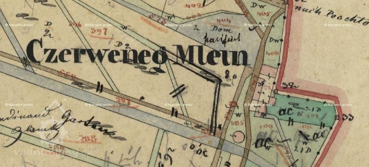Dnešní Šlapanický rybník (dříve Červený) po většinu doby existence mlýna nebyl napuštěn. Byl zřízen v roce 1750, avšak v roce 1772 už byl  vypuštěn a na jeho místě byl zbudován sad jabloní, hrušní a švestek. Ovoce se vyváželo do ciziny.