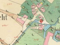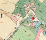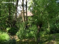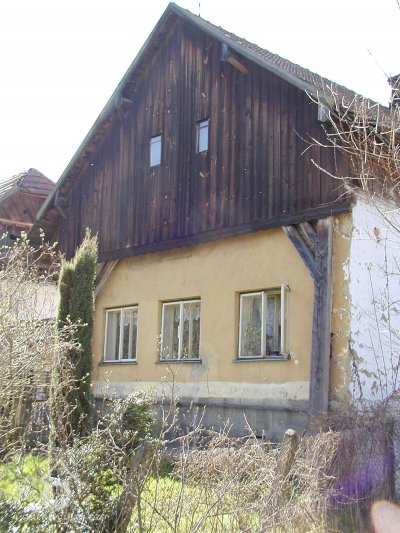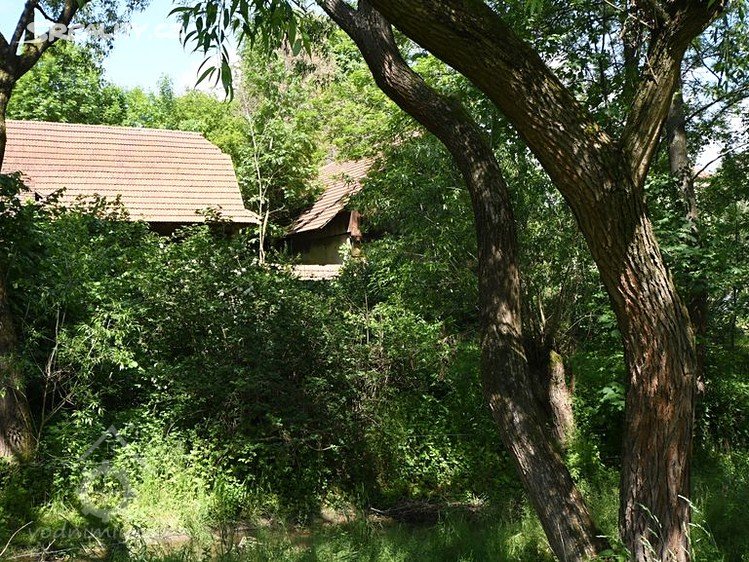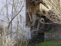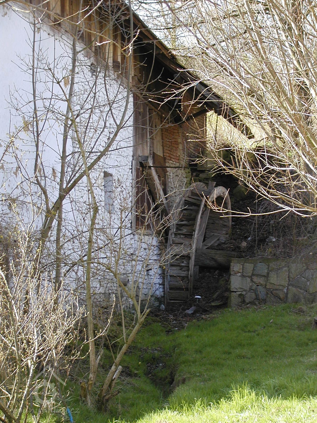 Roubený mlýn trojdílného půdorysu se zbytky vodního kola na horní vodu.