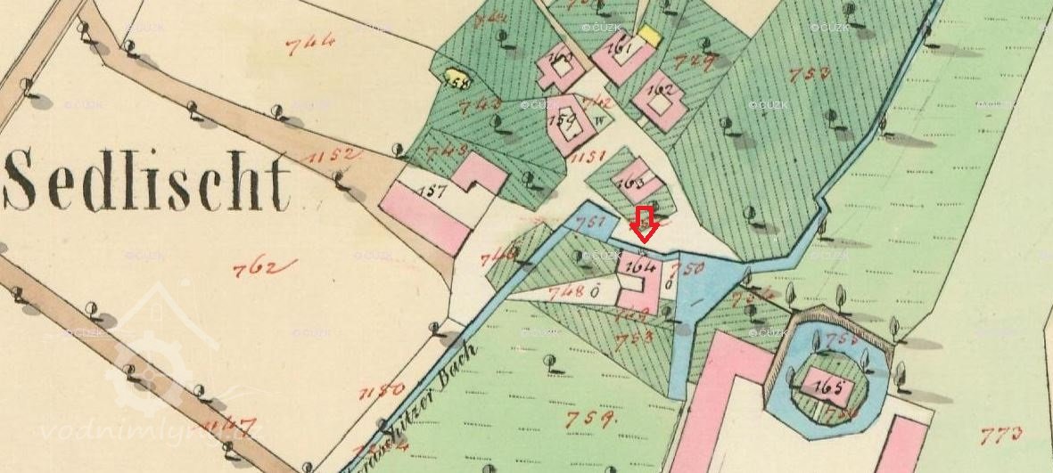 PopisDle záznamu ve Vodní knize v roce 1929 mělo vodní kolo na vrchní vodu průměr 4,2 m, šířku mezi věnci 0,5 m a hloubku věnce 0,23 m. Při maximálním průtoku 55 l/s dávalo výkon 2,41 HP.