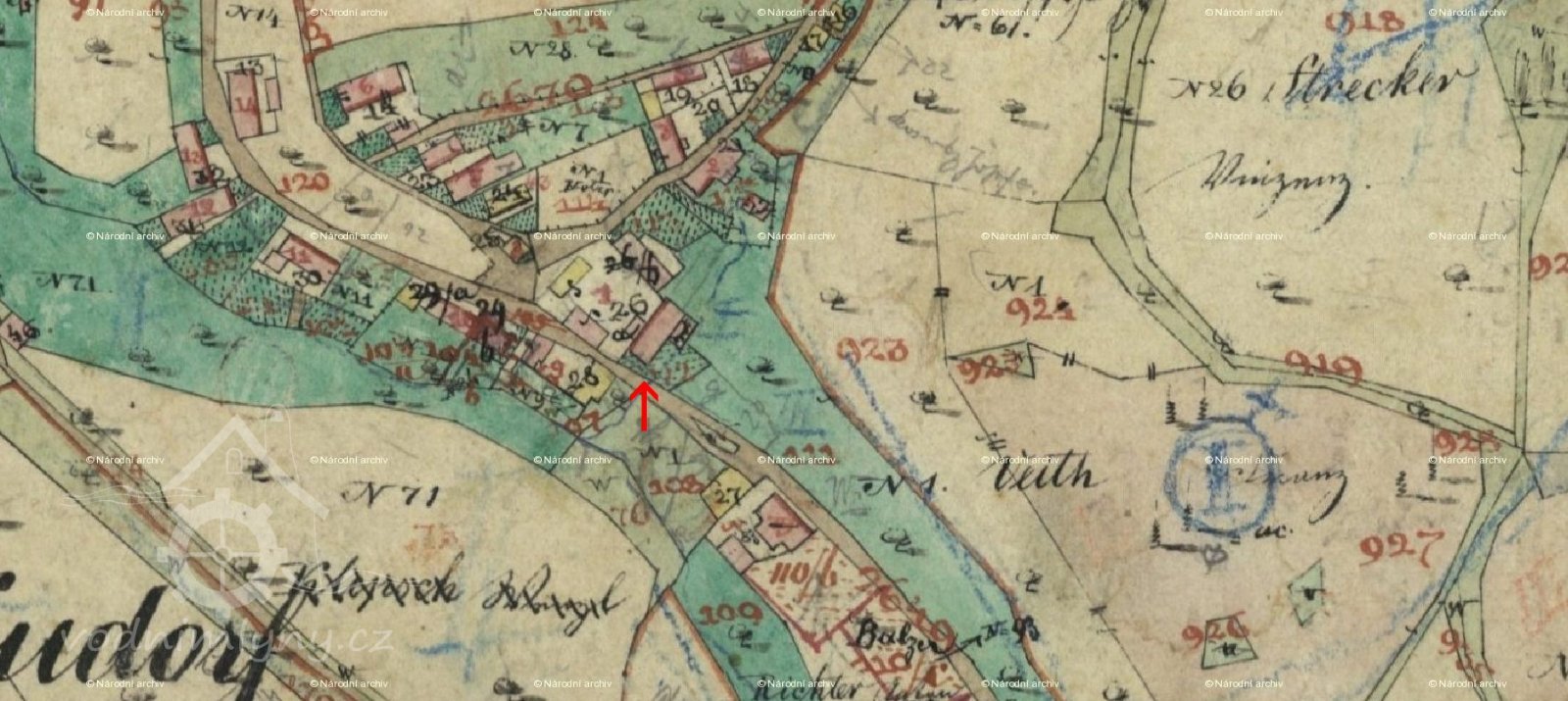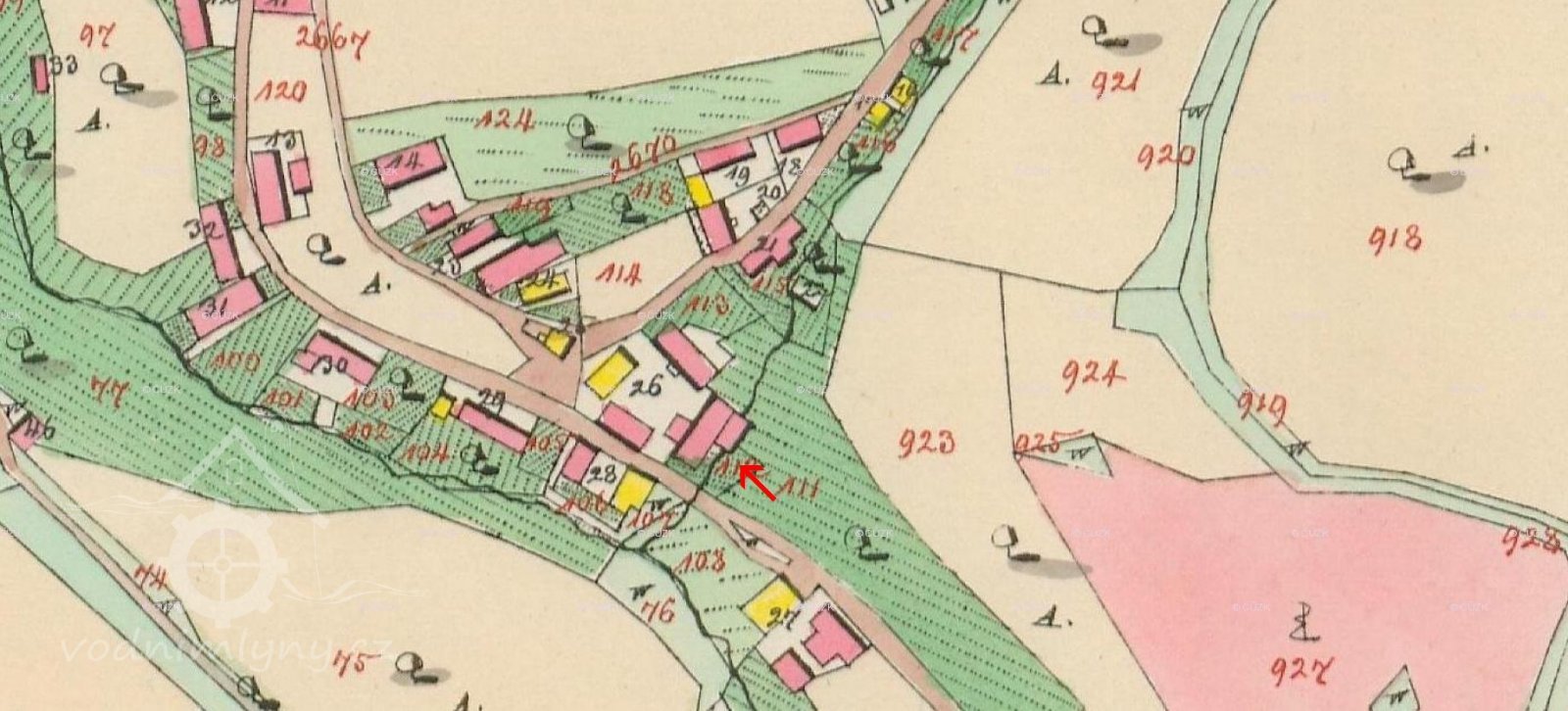 V roce 1930 byl majitelem mlýna a pily František Veit. V "Seznamu vodních děl Republiky Československé" je jako vodní tok uveden Tlučenský potok. Tlučenský potok teče hluboko pod mlýnem a v kolmém směru na zbytek vodního díly u mlýna. Mlýn byl napojen dlouhým náhonem (cca 1 km) z potoka Rytina. Současný vodní tok náhonu se odklání od původního směru cca 300 m nad mlýnem. Náhon ke mlýnu byl zrušen.