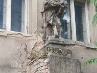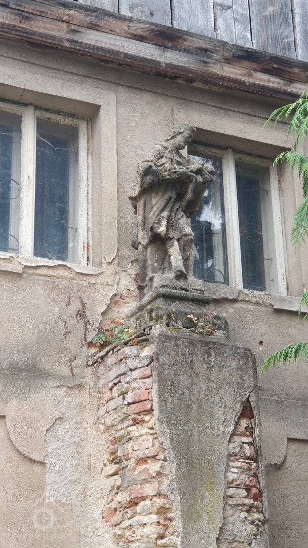 Před průčelím barokní pískovcová socha sv. Jana Nepomuckého.