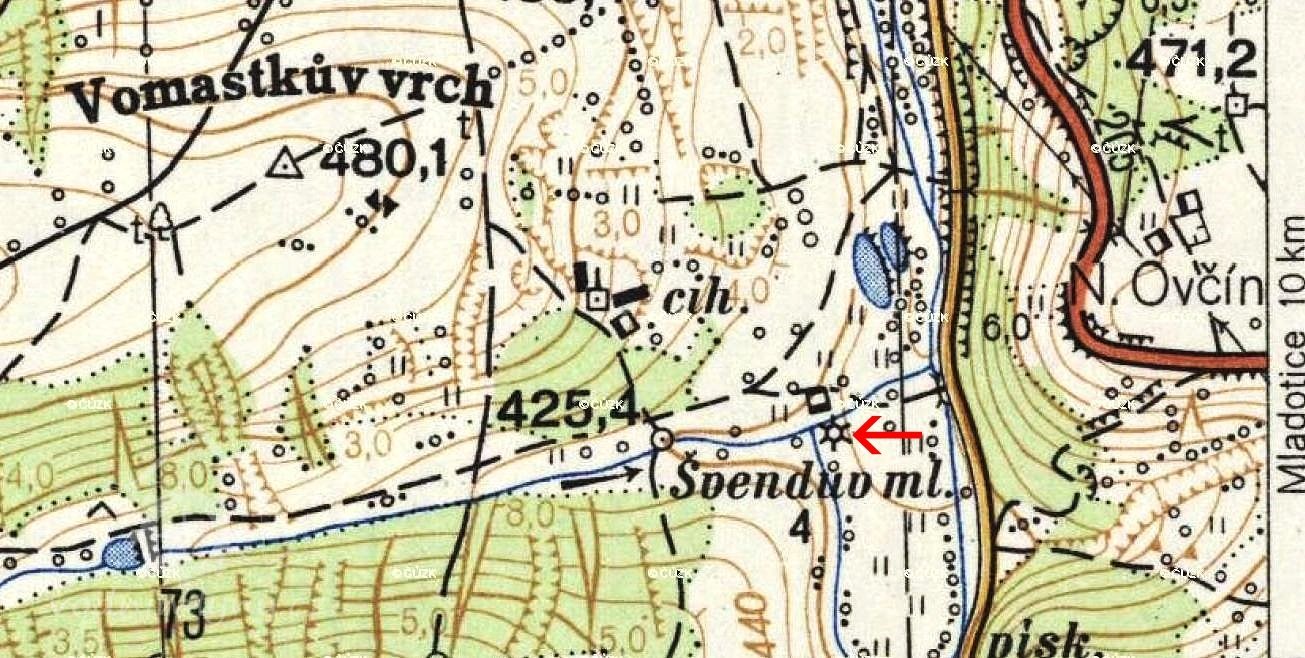 Na obecním pozemku nacestě do Švendova mlýna, zvaného na Vomastkojc, stával dřevěný kříž s plechovým obrazem Krista. V roce 1838 byl velmi zašlý znovu obnoven.