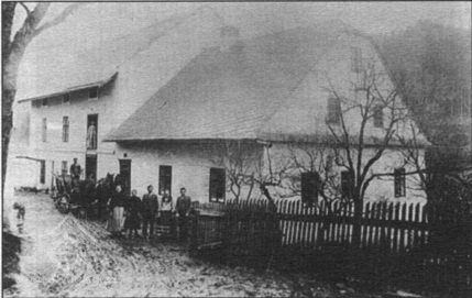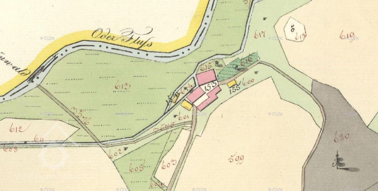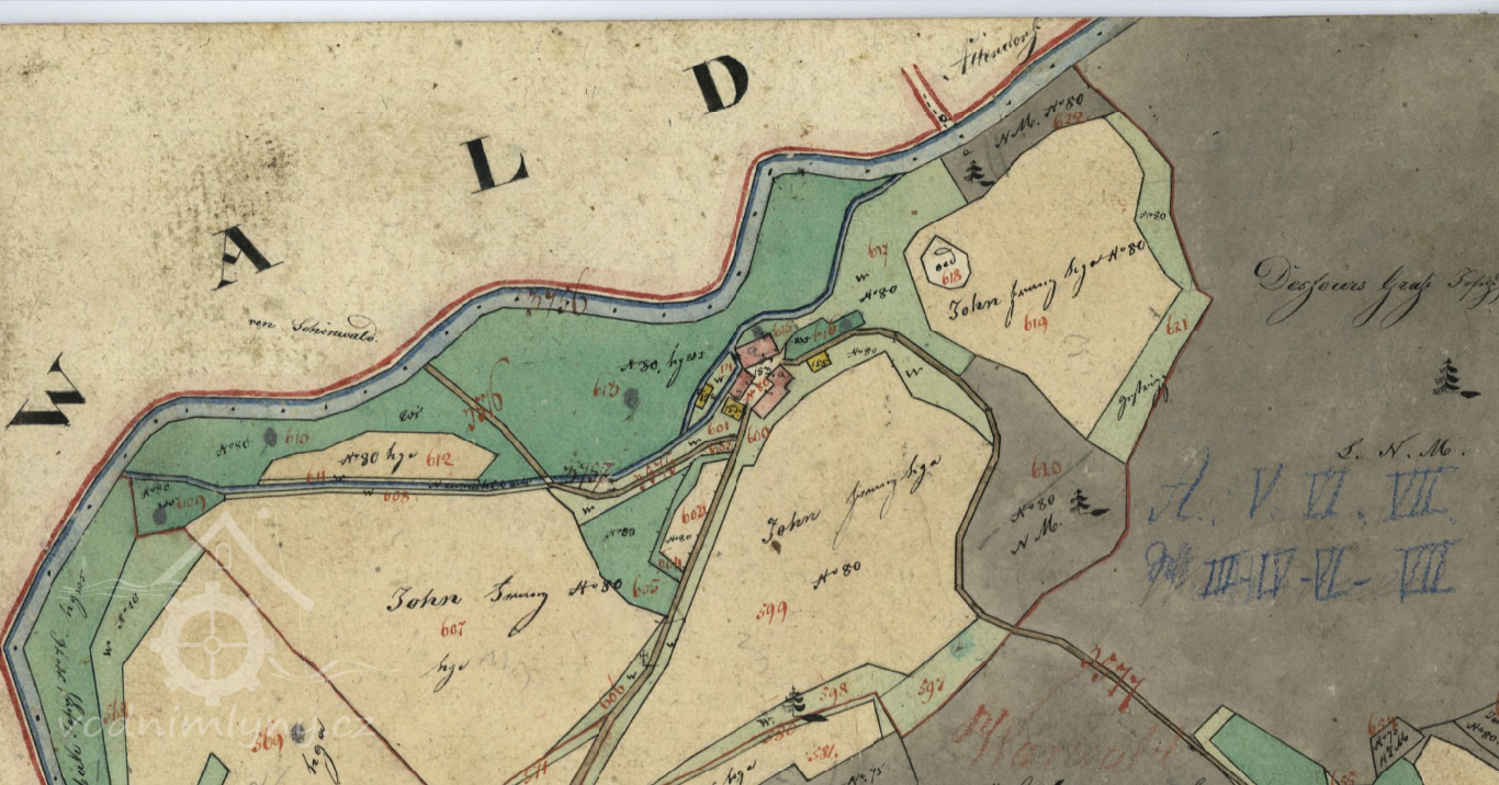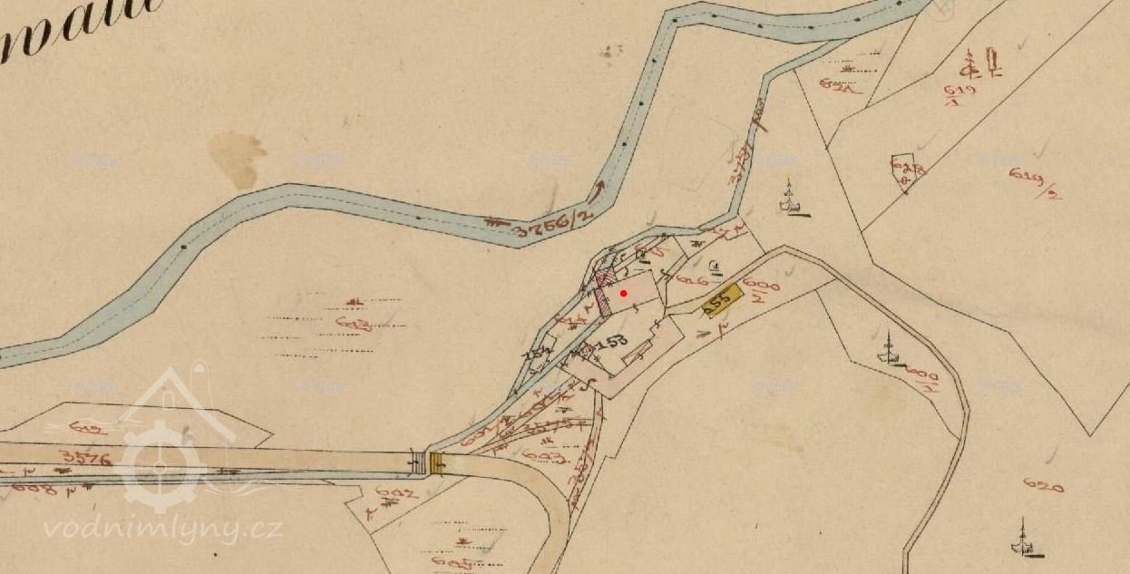1930 majitel Augustin Schwarz, kolo na horní vodu s výkonem 3,92 kW, druhé kolo pohání pilu