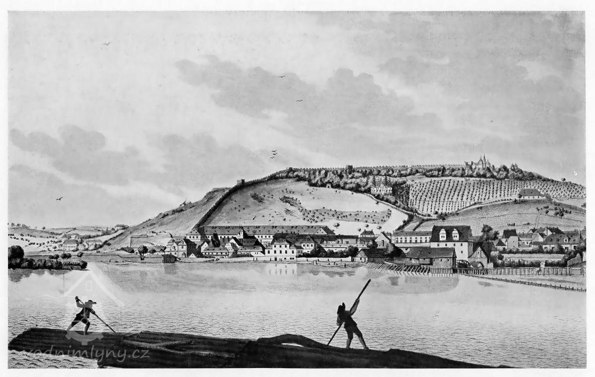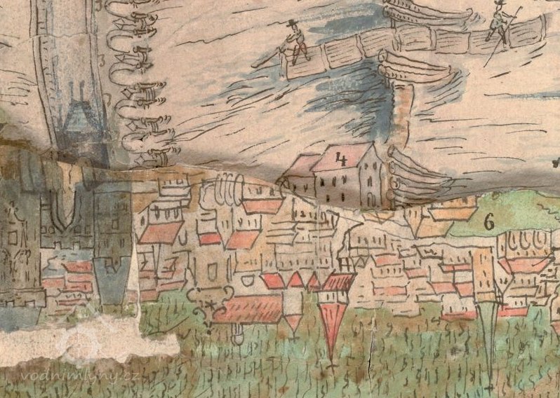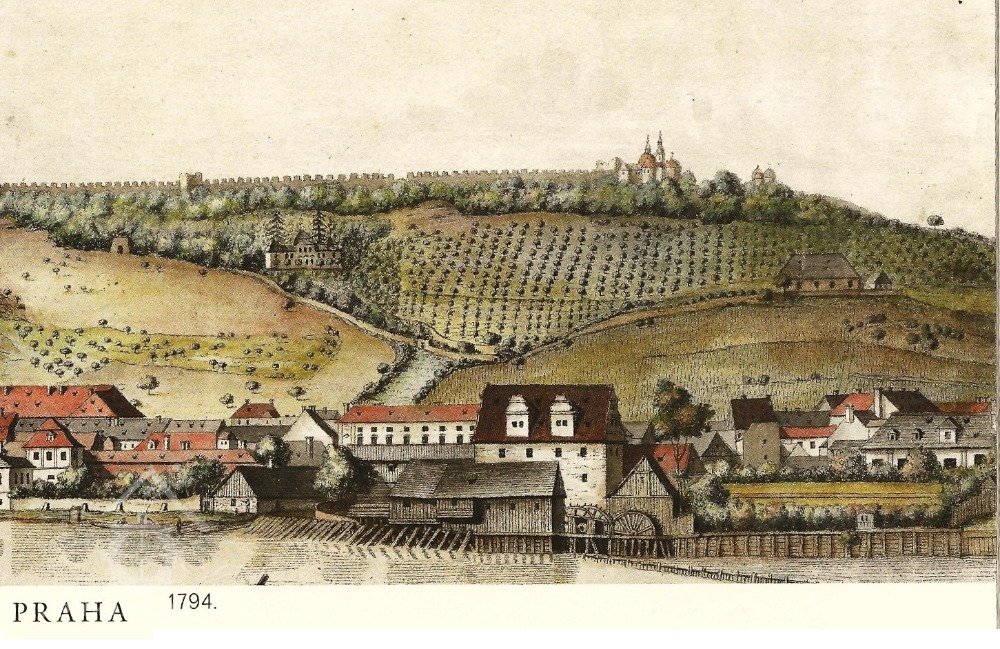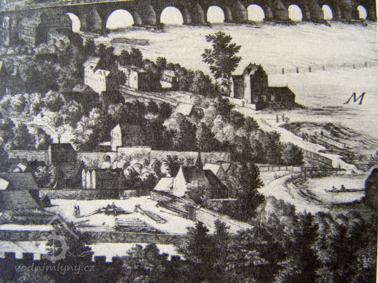 1606 na van den Boscheho prospektu Prahy mlýn zachycen v podobě, jaká se dochovala až do poč. 19. stol.