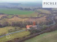 Letecký pohled - jez a začátek náhonu, 11 2025, © Pichler reality group, (Prvky na obrázku: jez, náhon)