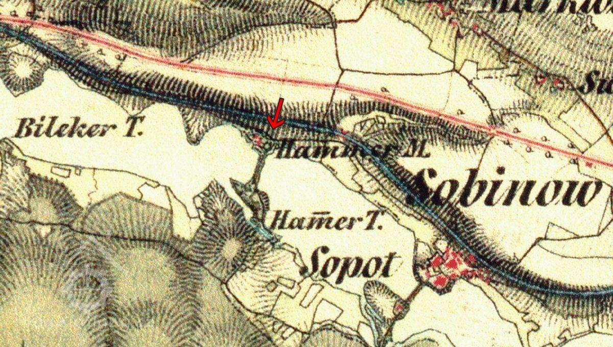 V dnešní době zde opodál stojí budova bývalé Hájenky. Po levé straně cestou od Sopot je vidět v lesíku před hájenkou vykopaný hluboký náhon. Místo je dnes pusté, porostlé stromy.