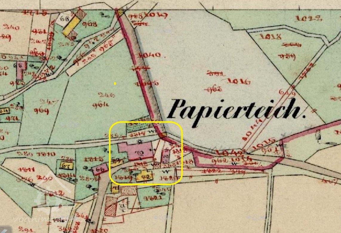 Velká budovy mlýna a později papírny stojí pod rybníkem Papírník na okraji obce.