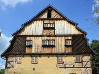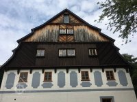 Podkrovní prostory mají tři podlaží a v minulosti byly využívány k sušení vyrobeného papíru.Rozdělení podkroví na tři části je patrné i zvenčí v členění vysokých svisle bedněných štítů s řadami oken.Hrázděné zdivo je zakryto omítkou, která byla obnovena v druhé dekádě 21. století v původních barvách – bílé a šedomodré (tzv. barva holubí šedi).