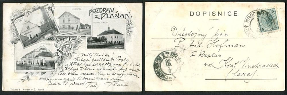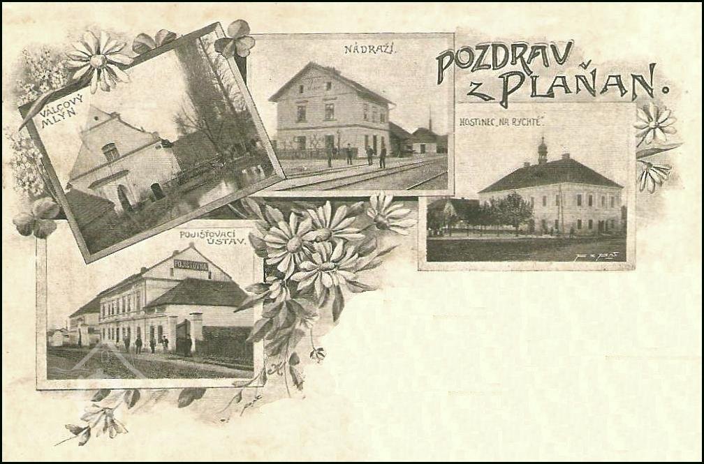NázevPLAŇANY. Nádraží. Válcový mlýn. Pojišťovací ústav. 1900.