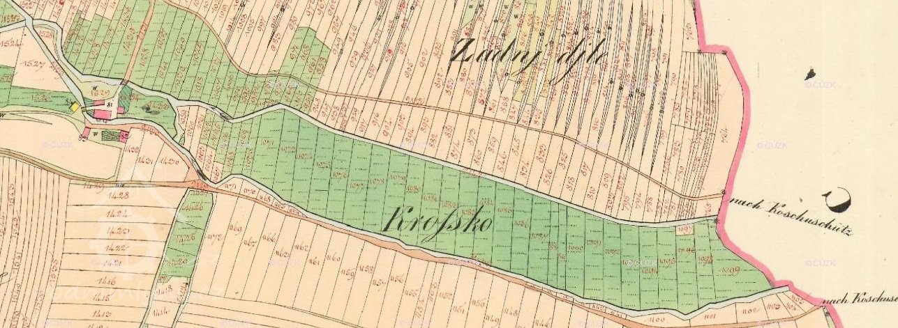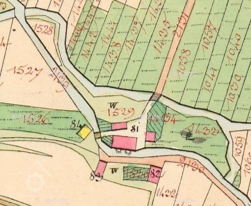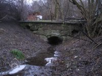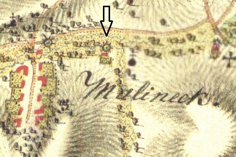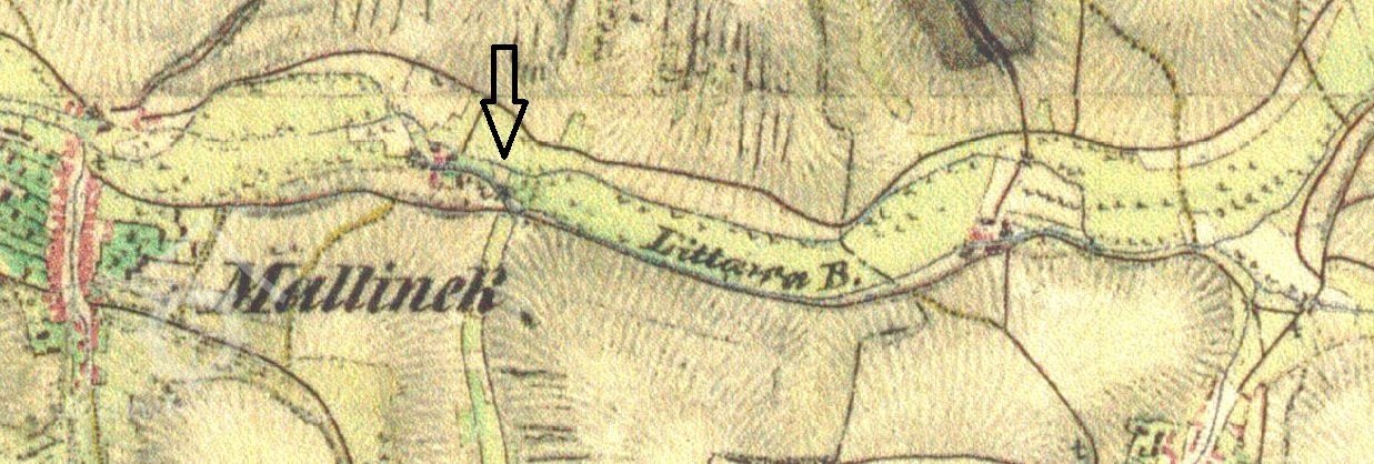 Mlýn využíval společný náhon s dalšími dvěma mlýny (jeden výše, druhý níže). Náhon zasypán. V bezprostřední blízkosti bývalé mlýnské budovy zasahuje (částečně) do odpadní strouhy současná silnice č.50 (postavena 1939) - původní cesta vedla po hraně terénního stupně asi 60m jižněji.