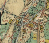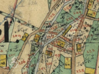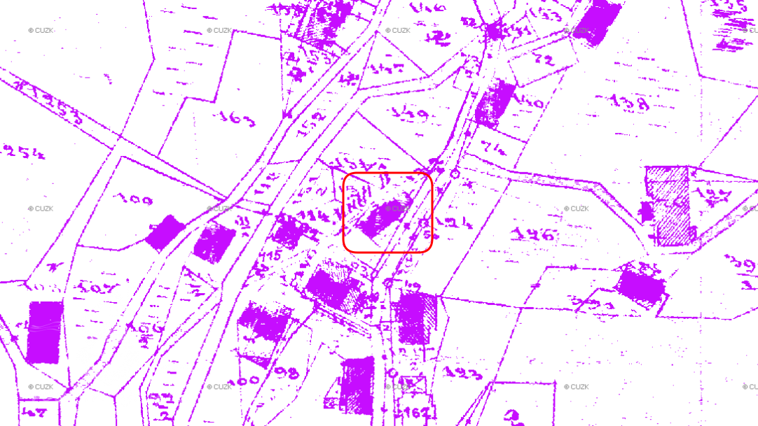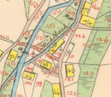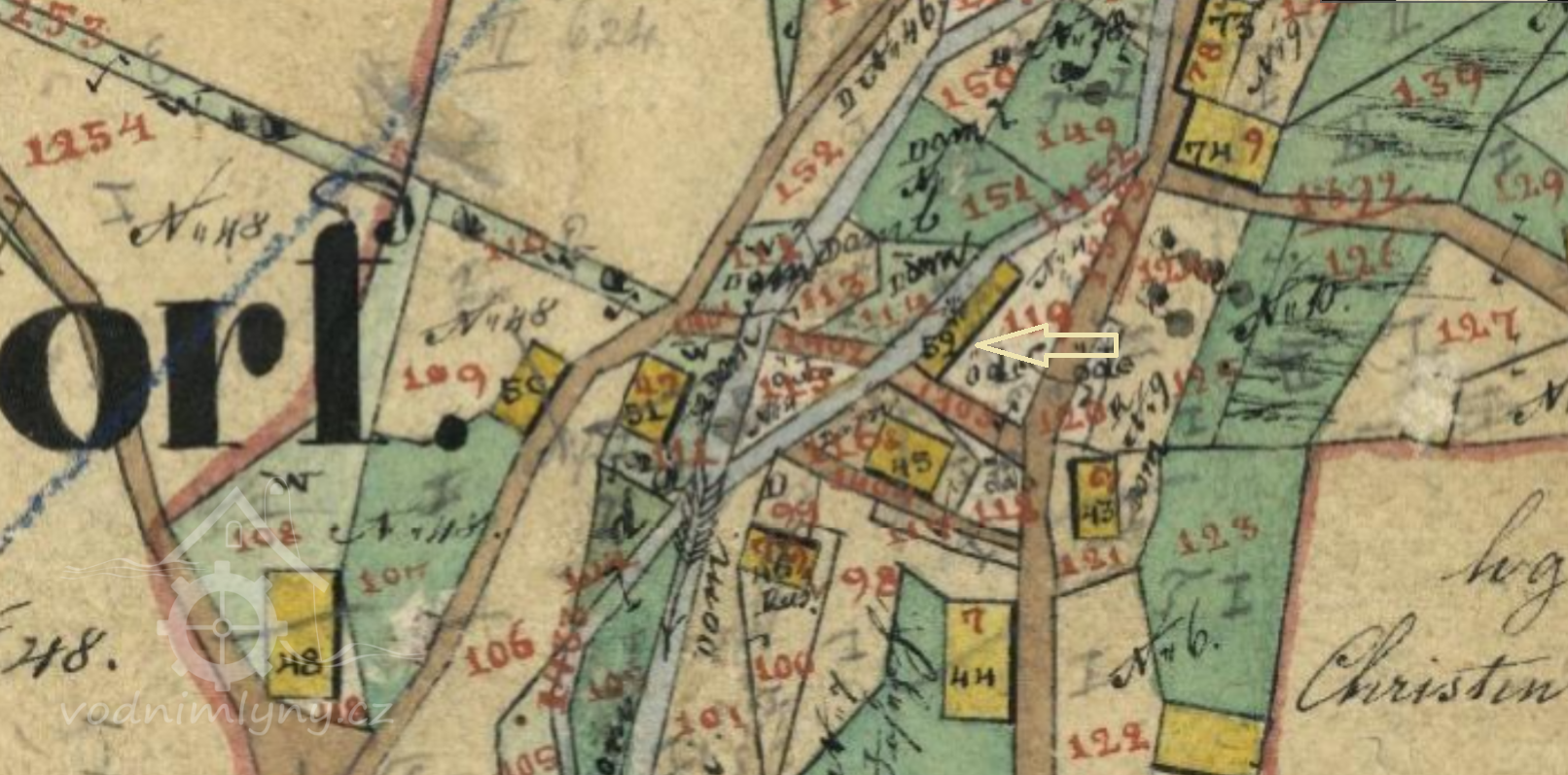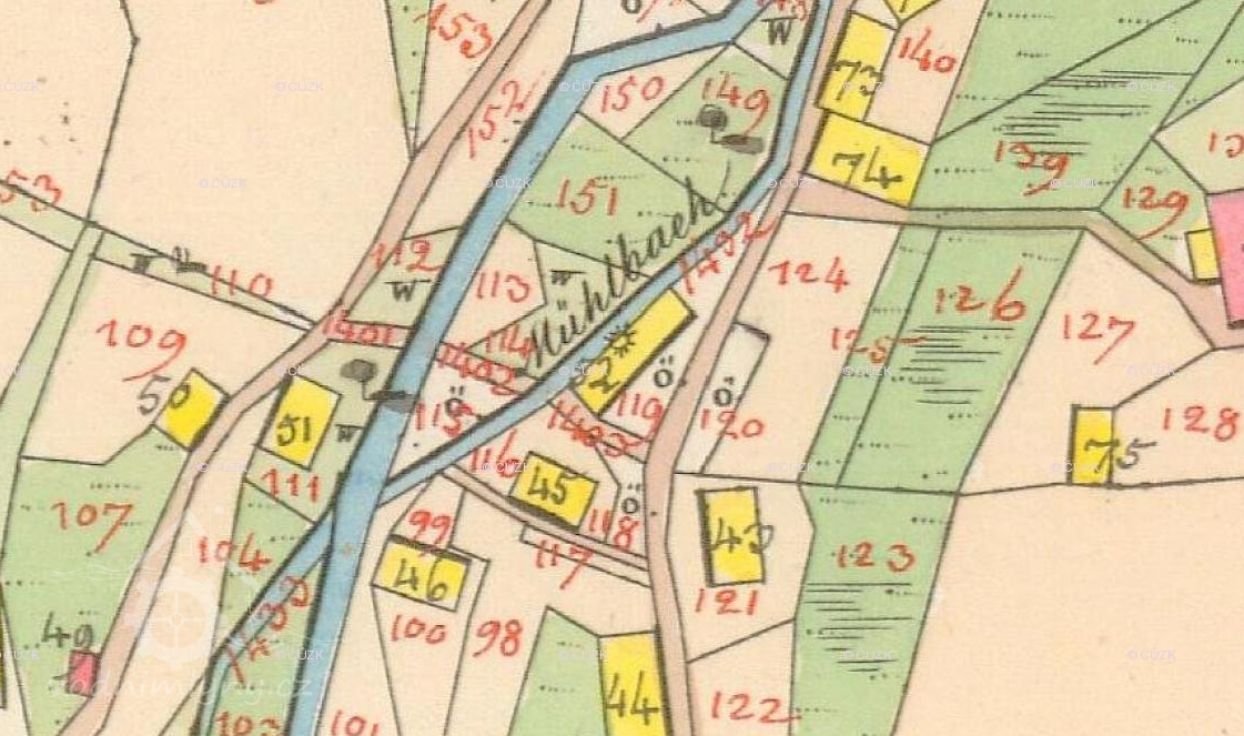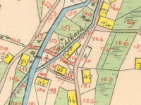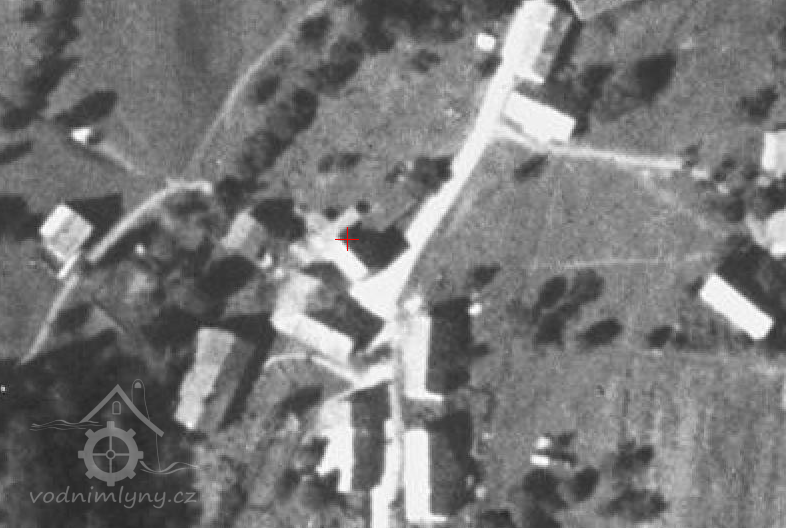 Původní dřevěná budova mlýna je na císařském otisku zakreslena severněji, nynější budova byla postavena později.