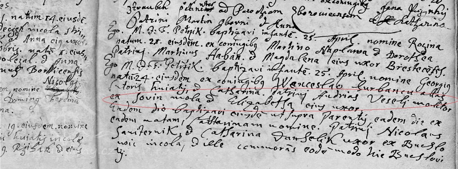 25.4. 1665 - šli za kmotry Ondřej Veselý, mlynář ze Sovína, a jeho manželka Alžběta za kmotry Jiřímu, synovi Václava Hurbancu a jeho ženy Kateřiny
