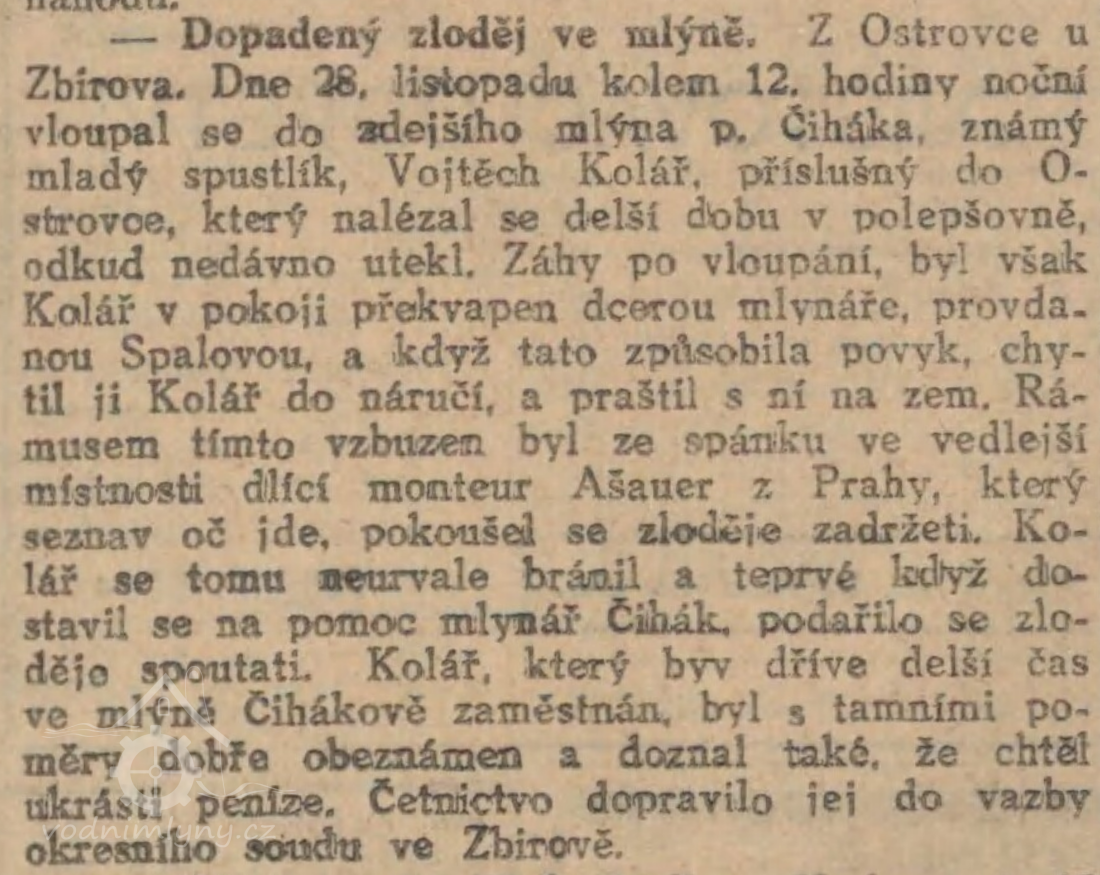 1843 mlýn vyloupen a mlynářka Martie Fikyšarová (75 let) uškrcena, údajně to provedla jistá Šnáblová z chalupy u potoka na cestě do mlýna (tzv. Vaněčkovic chaloupky)