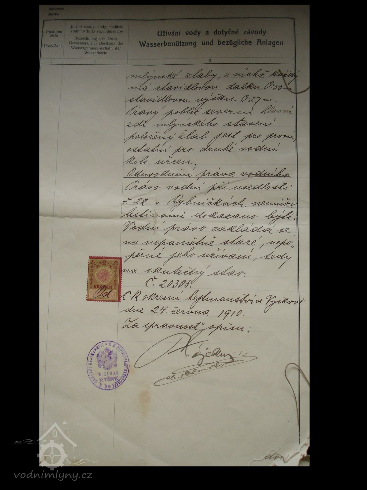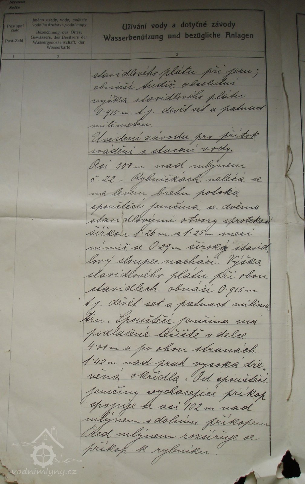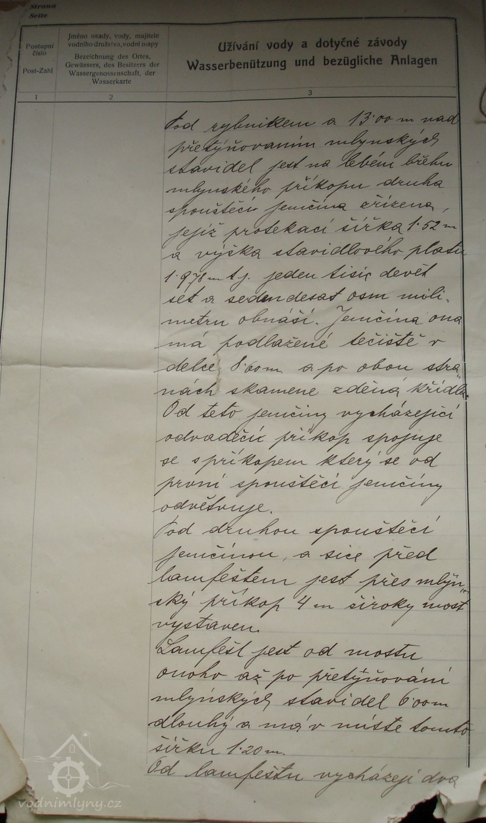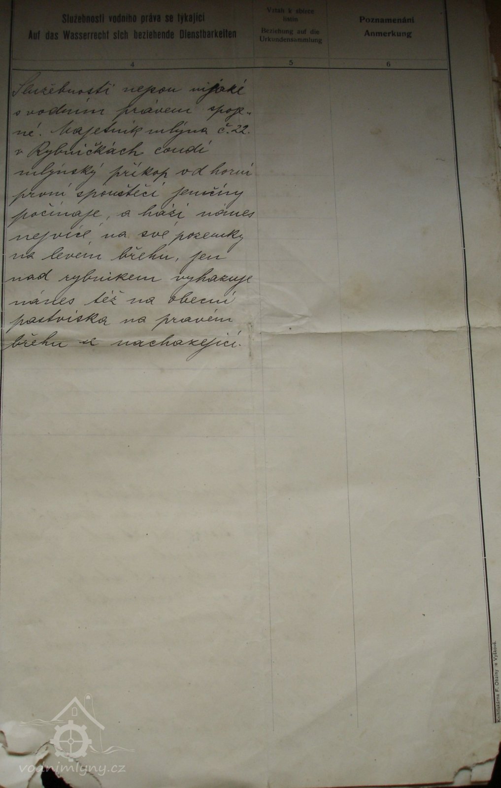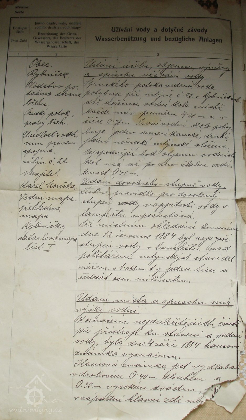 PopisV r. 1930 zde bylo 1 kolo na svrchní vodu, průtok 0,11 m3/s, spád 4,5 m, výkon 4,3 m.