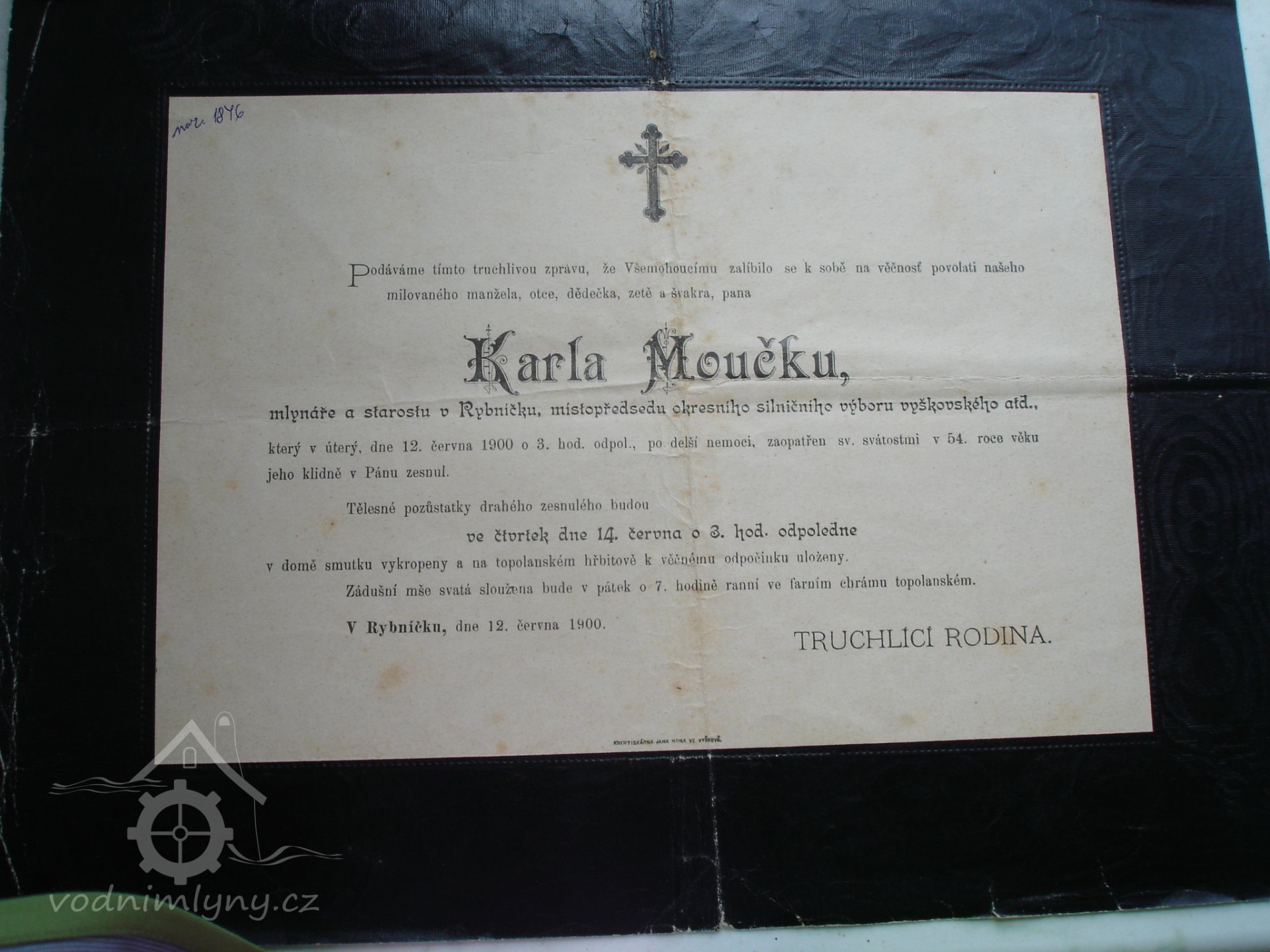 Karel Moučka * 18.02.1847 Rybníček č.22 † 12.06.1900 Rybníček č.22