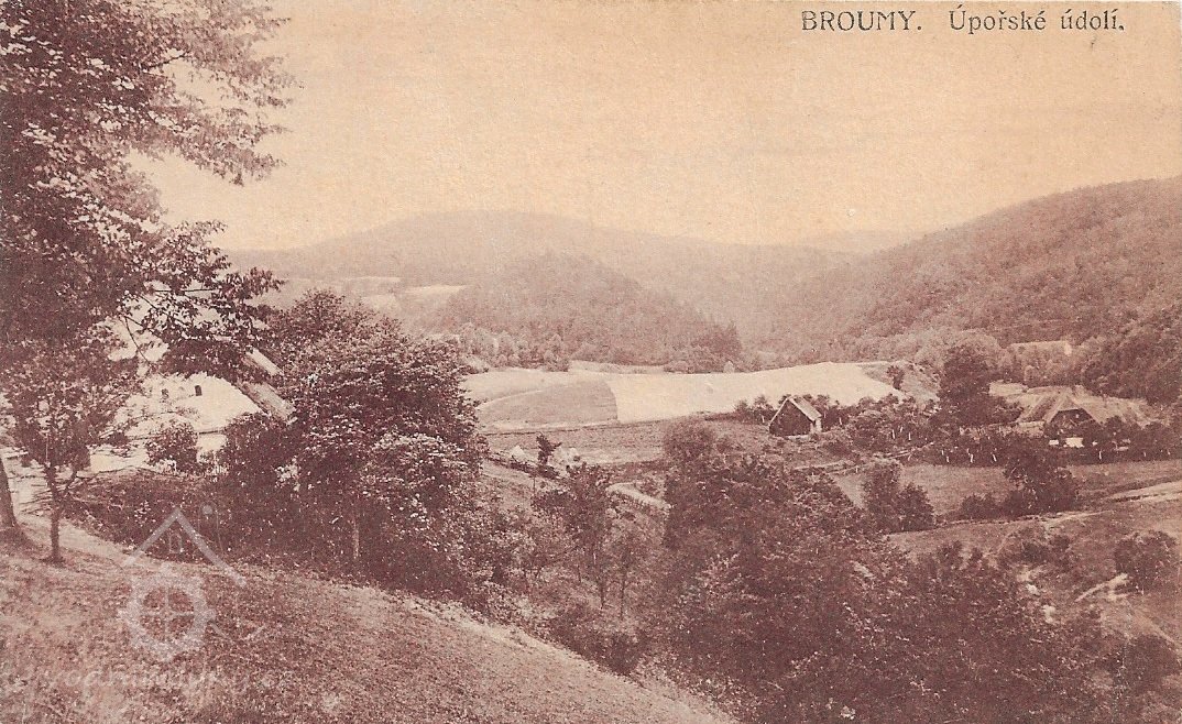 Mlýn s půčelím jižním byl vystavěn v nadmořské výšce 340 m necelých 30 m od levého břehu Úpořského potoka 1 km SZ od staré broumské návsi v místní části Úpoř. V roce 1872 se setkaly v oblasti tři bouřky a přišla obrovská průtrž. V úzkém údolí se voda neměla kam rozlít a vytopila mlýn. Mlýnská budova prošla ve 20. nebo 30. letech 20. století výraznou přestavbou. Do té doby byl mlýn přízemní s roubenou obytnou částí a poměrně vysokou sedlovou šindelovou střechou při východním štítu s polovalbou. Zda byl mlýn roubený po celém obvodu a existovala i západní polovalba není doloženo. Jisté je, že ve východním štítu byla čtyři okna (dvě okna obytné místosti měla větší rozteč než dvě podkrovní). Na východní štít navazovala zahrádka ohraničená dřevěným plotem. Komín vystupoval ze severnější poloviny střechy. Zmiňovanou přestavbou dostala mlýnská budova podobu celozděné "kvádrovité" patrové stavby s nevýraznou velmi nízkou sedlovou střechou s komínem v její jižnější polovině (tato podoba je dochována do současnosti). Vodní kolo, jež bylo umístěné při západním štítu mlýna, poháněl zhruba 150 m dlouhý náhon (v současnosti v terénu zčásti znatelný). Náhon odbočoval z Úpořského potoka do jeho levého břehu asi 50 m pod rybníkem (dříve nazývaný Dvorský, v nynějších mapách Kučerák, situovaný jižně od mlýna), který napájel. Ještě před r. 1914 byl k severní straně mlýna (ne k úplně celé S straně mlýna) přistavěn kolmo objekt se sedlovou střechou. Tento přístavek, jenž sloužil mj. pro přidružený vodní provoz pro potřeby hospodářství, zanikl někdy v letech 1953 - 1961 (v r. 2021 ještě stály vyskoké ruiny zdí přístavku). V r. 1936 za nových majitelů Jandů vzniklo vedle mlýna obytné stavení čp. 201 na st.p.77/2. Tento nový dům byl vystavěn částečně v místě býv. hospodářského objektu (stojícího JV při mlýnu) - trochu však posunut SV směrem. Je možné, že zároveň s výstavbou nového domu proběhla i zmiňovaná přestavba mlýna. Původní mlýnská st. parcela č. 77 tím byla rozdělena a mlýn tak obdržel parcelní číslo 77/1. Rodiny mlynářů až do vzniku nového vedlejšího domu žily ve východní části mlýnské budovy (v západní části byla mlýnice). Svého času ke gruntu náležely tyto pozemky: čtyři pole (dvě jižně a dvě západně od mlýna při cestě k dolejšímu mlýnu ((pův. jen pile)) čp.74), louky a pastviny (ty z větší části) směrem od rybníka ke mlýnu po obou stranách Úpořského potoka, které se táhly dále při potoce severně a západně od mlýna. Zda se ve mlýně mlelo i za 2. sv. války není zjištěné. Provoz mlýna byl definitivně ukončen v r. 1948 nástupem komunistické vlády, za které bylo někdejší mlýnské budově číslo pop. 40 odejmuto (v r. 2021 byl objekt býv. mlýna stále bez č. p. i č. ev.) a přeneseno na obytný objekt (pův. sloužící jako hájovna) 400 m ZSZ vzdálený. Dům čp. 201 byl obýván potomkem posledního mlynářského páru Jandů prokazatelně ještě v r. 1965, kdy již okolní pozemky dříve patřící k mlýnskému gruntu obhospodařovalo JZD Broumy. Jiný potomek Jandů objekt někdejšího mlýna i vedlejší dům č. p. 201 později prodal k rekreačním účelům novým majitelům - již mimo příbuzenství. V té době (na sklonku komunistické vlády) k vlastnictví mj. patřily: studna, domácí vodárna, dva chlévy, zděný kurník, venkovní sklep, suchý záchod, dvě dřevěné králíkárny + strojní zařízení mlýna nezpůsobilé provozu. Hospodářský objekt 50 m jižně od mlýna na st. p. 76, též původně náležící k majetku mlynáře, byl také prodán a přestavěn na obytný dům čp. 347.