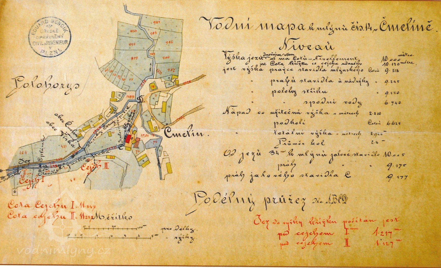 V r. 1930 zde bylo 1 kolo na svrchní vodu, průtok 0,139 m3/s, spád 2,7 m, výkon 3,2 k, prům. 2,68 m, šířka 1 m, hloubka korečku 0,26 m, 9 ot/min., max. výkon 2,69 ks