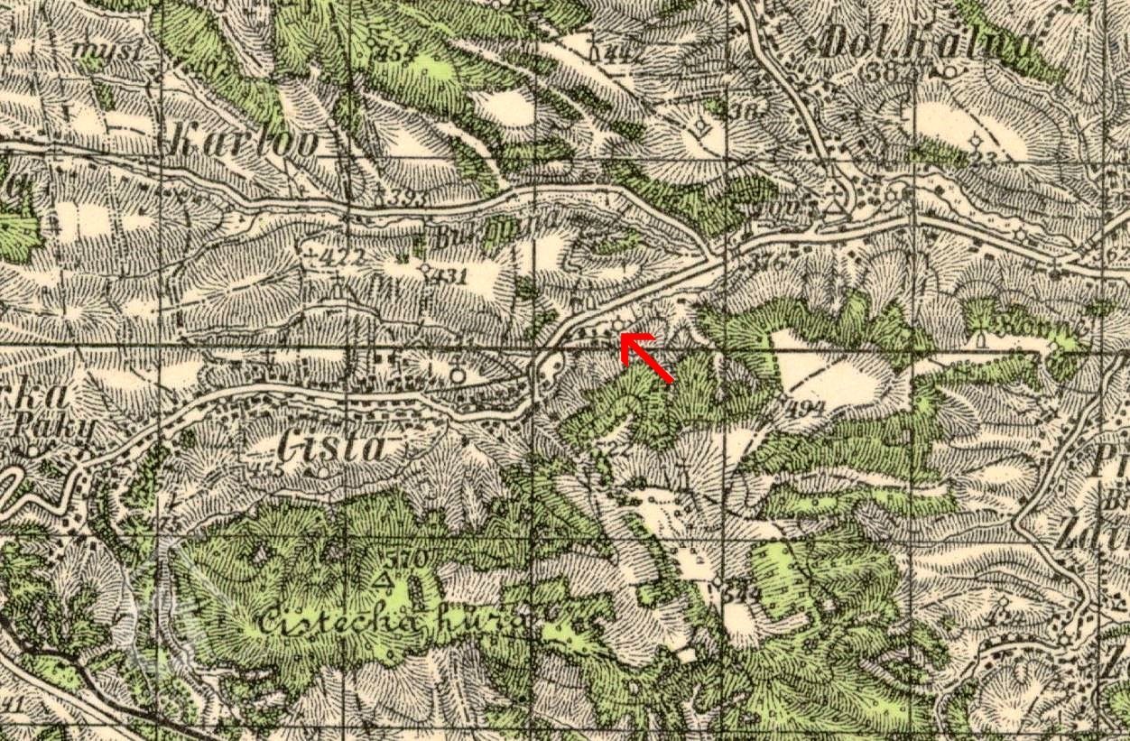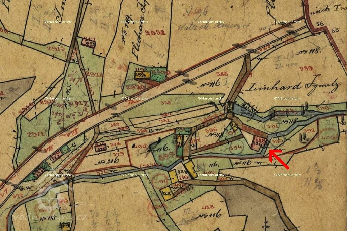 Zbytky bývalého náhonu viditelné, náhon byl napojený na pivovarský rybník v Čisté u Horek.