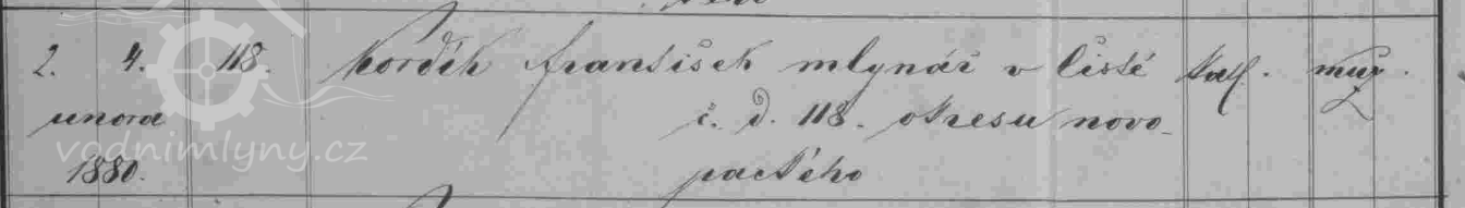 1880 zemřel mlynář František Kordík na mrtvici, 63 let. (RR)