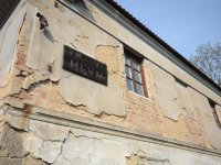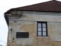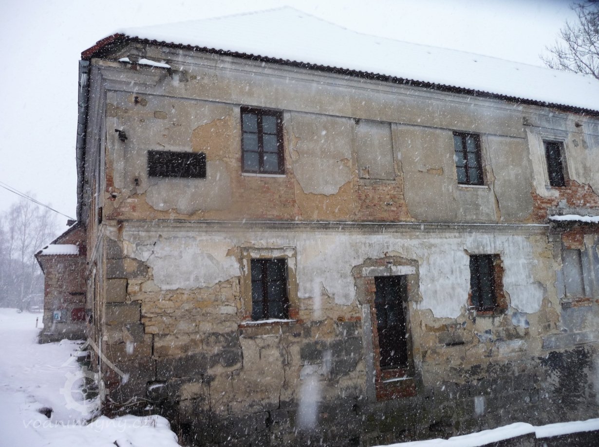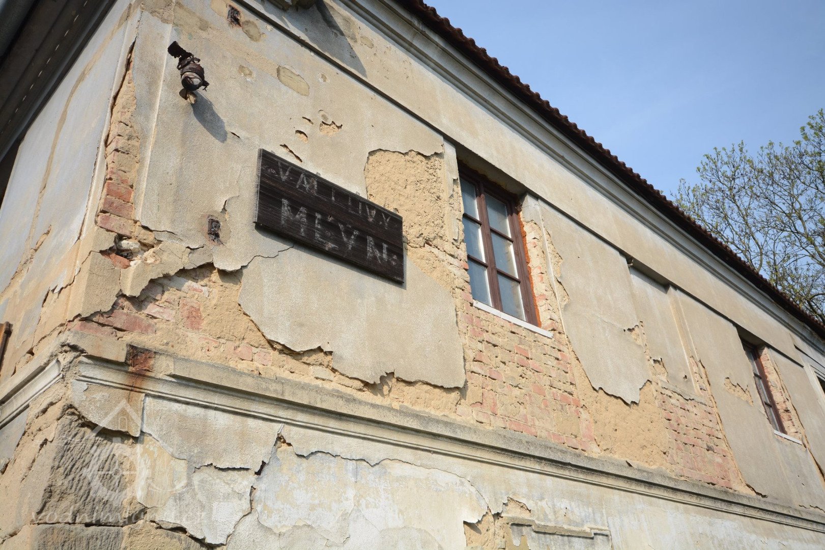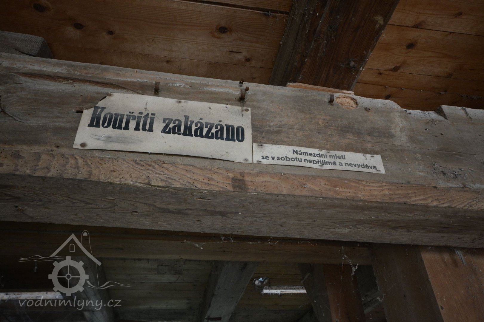 Na rohu mlýna je dřevěná špatně čitelná cedule s nápisem Válcový mlýn.