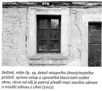 Zdivo starší části mlýna je smíšené - pískovec, opuka, zlomky cihel, mladší část mlýna je pouze z pálených cihel. V průčelích je dobře patrné druhotné přistavění sv křídla. Členění fasád je již silně narušené, kolem oken torza říms a lizénových rámců, kolem dveří ostění s profilovanými lištami. Na základě rozdílů ve zdivu je možno dobře odlišit jednotlivé stavební fáze. Hlavní křídlo má v jv průčelí orientovaném do silnice zachováno nejstarší smíšené zdivo pouze v úrovni přízemí (v rámci objektu 2. podlaží) v rozsahu dvou okenních a vstupních orvorů na pravé straně. (Spodní část zdiva je z pečlivě opracovaných pískovcových kvádrů se soklem a nadezdívka z opuky a hruběji opracovaných pískovců.) Otvory mají pískovcová ostění s profilovanou lištou po obvodu, uchy, kapkami a parapetní deskou (v interiéru šikmý parapet z přisekaných desek). Druhý otvor zprava sloužil původně jako okno, teprve druhotně došlo k proražení parapetu a ke zřízení vstupu. Ve střední ose zprava je vchod s hladkým ostěním a ve čtvrté ose opět okno. Vlevo od něj je zřetelná spára, kde starší zdivo končí. Umístění otvorů odpovídá vpravo mlýnici a uprostřed síni. Levá, mladší část (světnice) z cihelného zdiva má 2 okenní osy a z cihel je vyzděno i celé patro (3. podlaží).