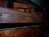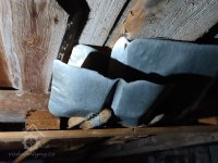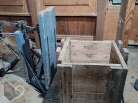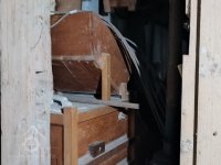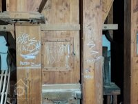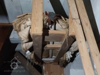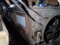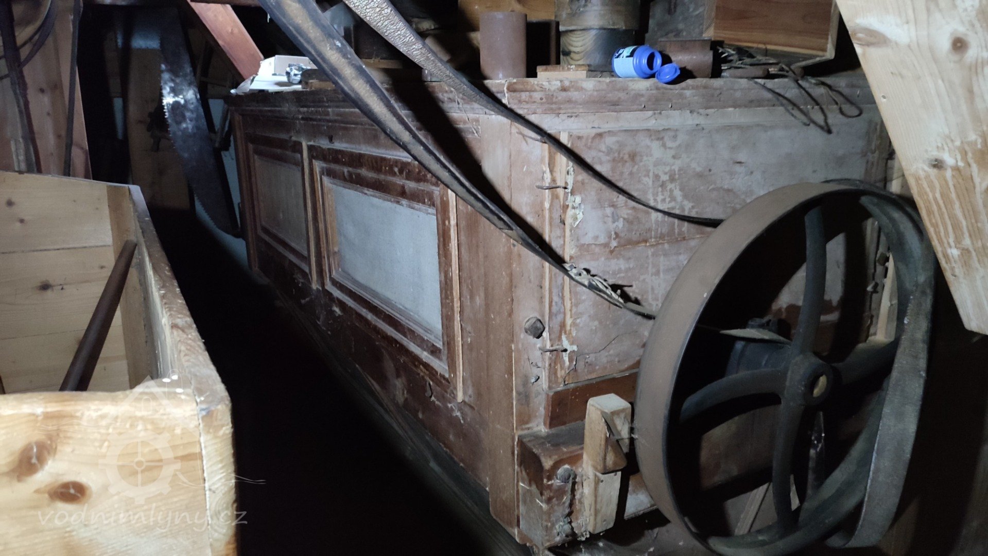 Dřevěný kryt řemenného převodu do patra pilnice, 7.2.2016, © Racocha, (Prvky na obrázku: transmise, řemenice, převody)