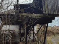 Venkovní transmise s řemenným převodem do patra pilnice, 7.2.2016, © Racocha, (Prvky na obrázku: transmise, řemenice, převody)