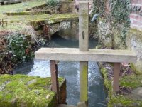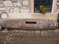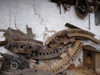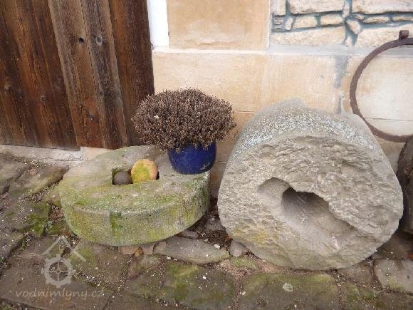 Na dvoře u mlýna je zbytek hřídele vodního kola, mlecí kameny a další zařízení.