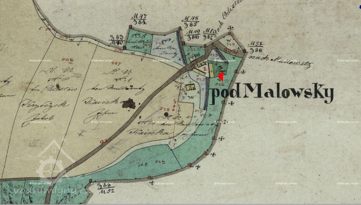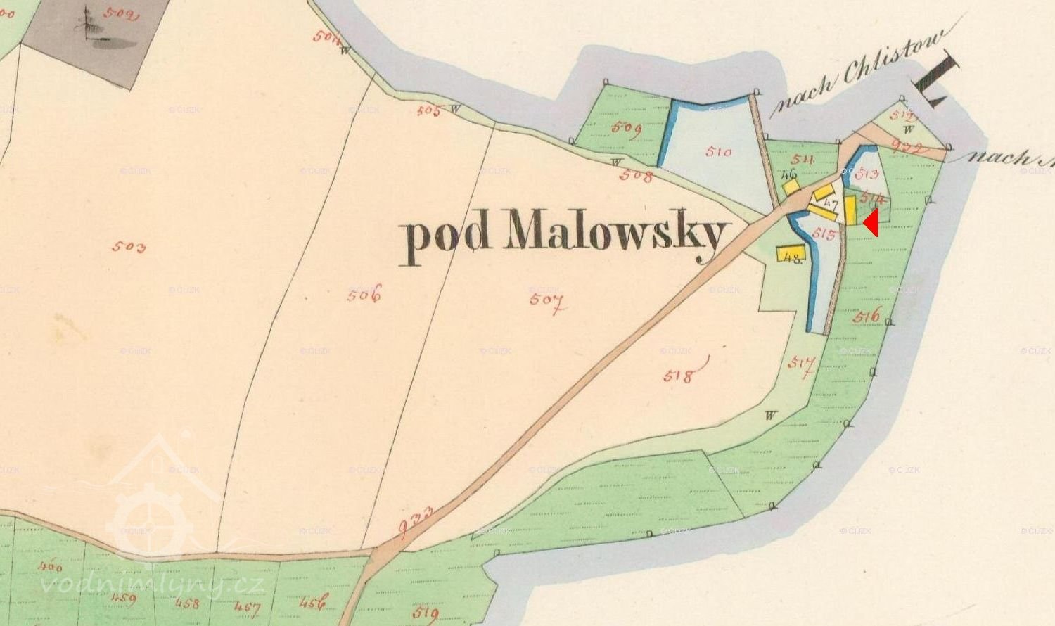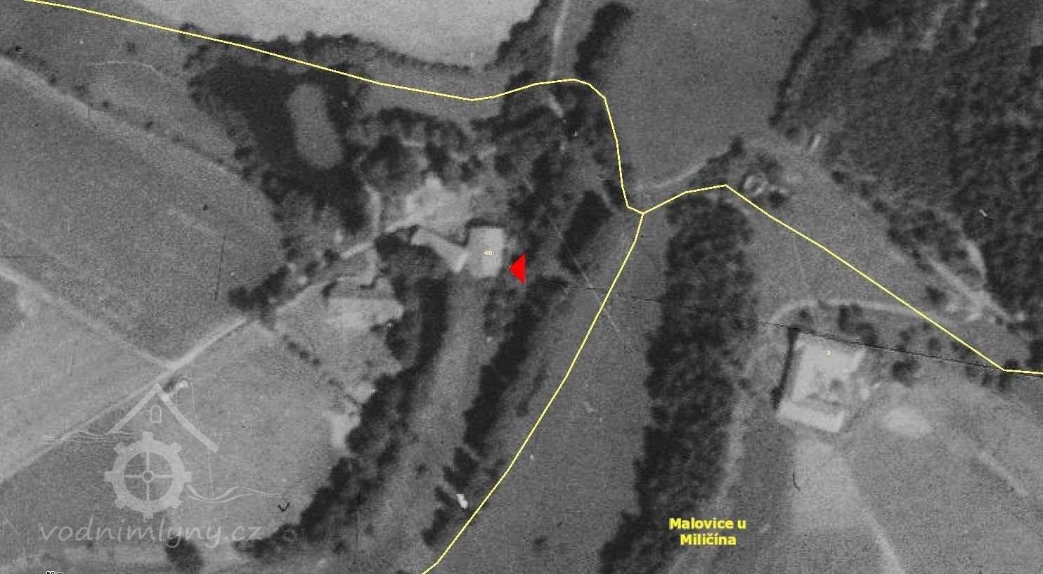 2.zápis – výměr z 17.4.1940; z vodní nádržky jde voda kamenným žlabem širokým 43 cm a vysokým 25 cm o délce 5,05 m; dále žlabem dřevěným širokým 23 cm, vysokým 20 cm a dlouhým 4,4 m jenž se před kolem rozšiřuje na 60x16 cm; vodní kolo průměr/šířka 3,95/0,74 m.
