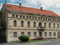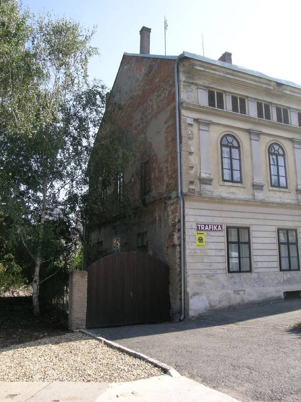 Místo posledního okna na pravé straně vedou další dvoukřídlé dřevěné, v horní části prosklené dveře do původního krámu. Dnes je zde agitační středisko. Nad vstupními dveřmi z průčelí vystupuje balkón, nesený čtyřmi konzolami, zdobenými volutami, zábradlí balkonu je z kamenných kuželek, rohové sloupky jsou jednodušší, kvádrové, madlo je rovněž kamenné kryté plechem. Okna patra jsou v dolní části stojná jako do přízemí. Shora na ně navozuje půlkruhová část členěná půlkruhem ve středu a dále dvěma paprskovitě navazujícími laťkami. Okolo oken jsou šambrány. Na balkon vedou s chodby patra dvoukřídlé dřevěné dveře s rovněž půlkruhovým nadsvětlíkem. Okna jsou rámována jednoduchými plochými pilastry, které jdou mezi kordonovými římsami nad přízemím a nad patrem. Na krajích u štítů je omítka zdobená nárožní rustikou.