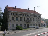 Hlavní západní průčelí jde směrem do ulice. Je členěno osmi okenními osami a ve středu jednou dveřní osou. U terénu začíná vystouplým zděným soklem, ve kterém jsou nízké široké otvory do sklepa. Okna přízemí jsou dřevěná, dvojitá, čtyřkřídlá, spodní křídla jsou dělená na polovinu. Omítka pod úrovní oken je hladká, mezi okny a nad nimi až k mohutné kordonové římse je členěna na vodorovné pruhy, které jsou okolo oken ukončeny svislou drážkou, která tvoří okolo oken rám, stejně jako okolo vstupních dveří. Před dveřmi jsou dva žulové stupně a omítané okrajové zídky.