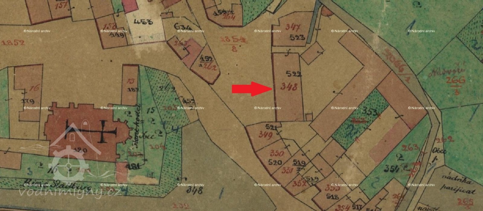 Dům čp. 348 je jediným pozůstatkem renesančního mlýna, přestavěného v klasicismu a po požáru v r. 1869. Architektonicky hodnotné je též neorenesanční průčelí.