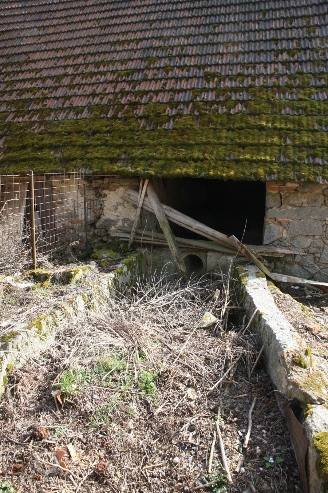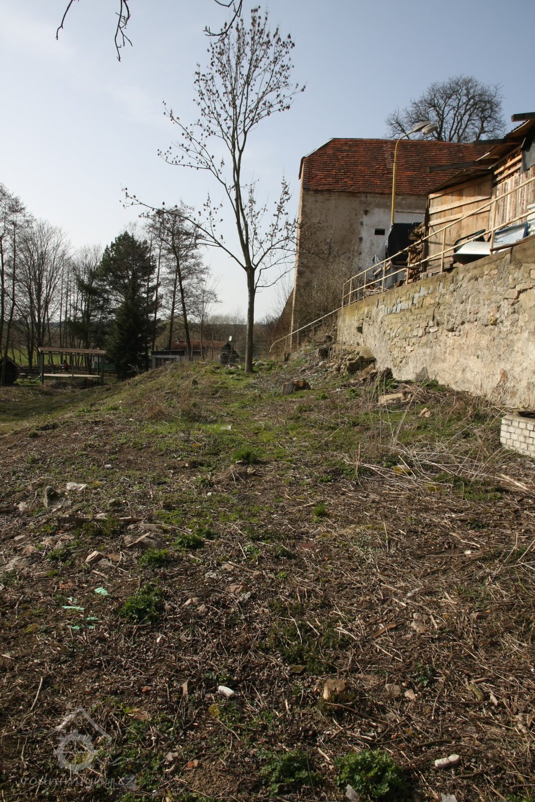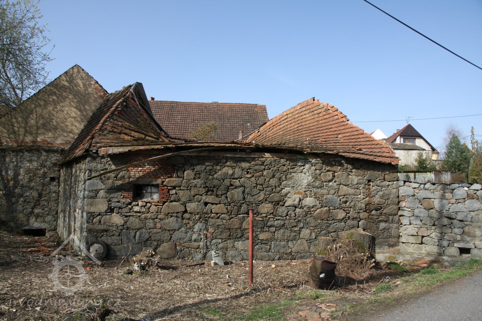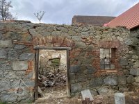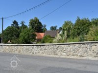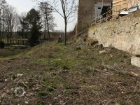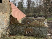 Kamenná ohradní zeď lemuje dvůr mlýna na parcele p.p. 99