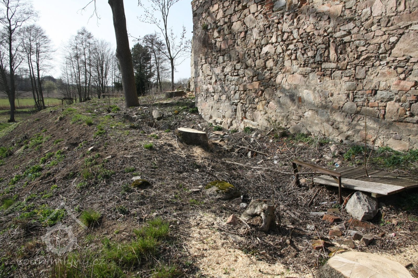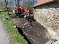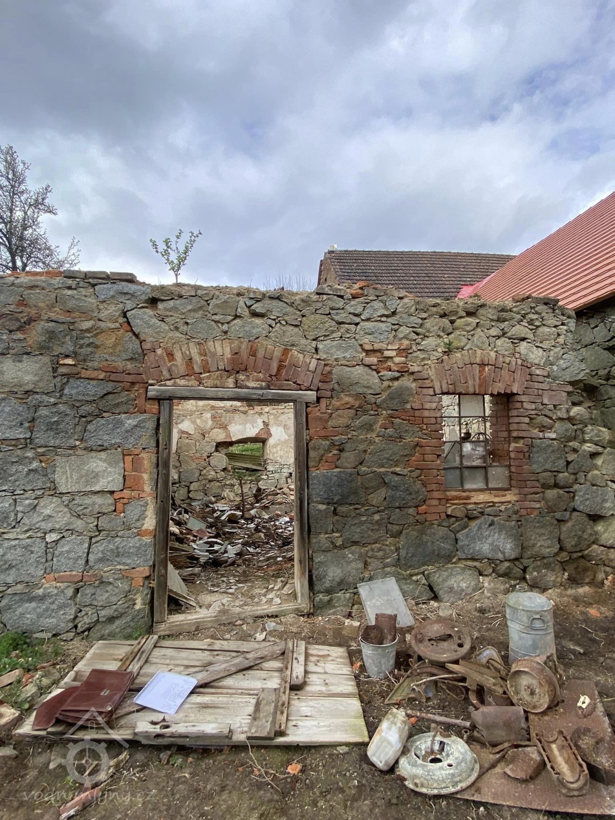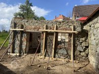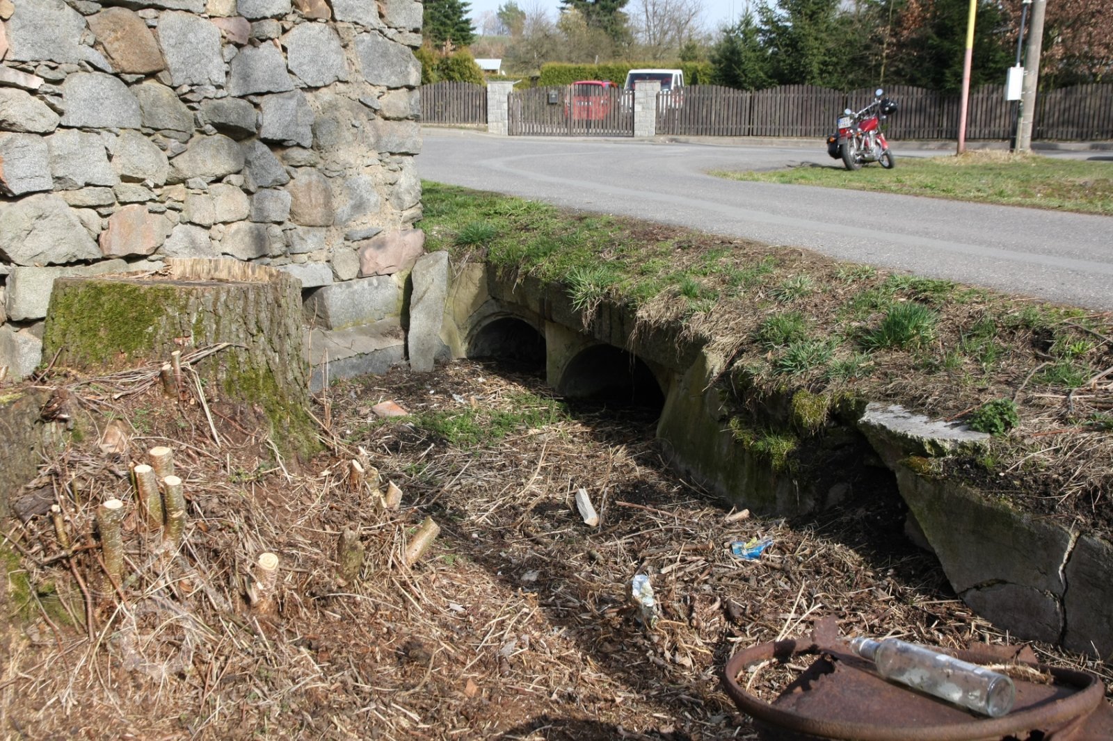Kamenná ohradní zeď lemuje dvůr mlýna na parcele p.p. 99