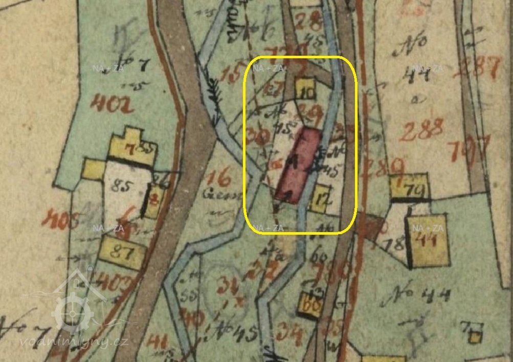 Stabilní katastr r. 1840: Bělidlo, mlýn, pila. Bělidlo patřilo k šolcově domu č.p.11.