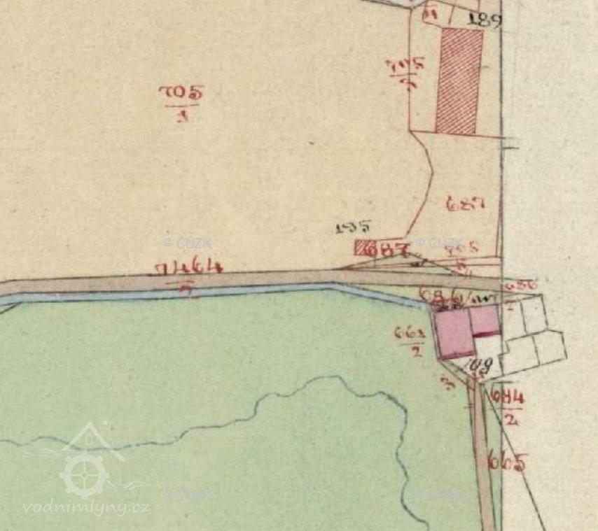 Ve stabilním katastru mlýn najdeme na severozápadním okraji katastru vsi Jetřichov, na indikační skice z r. 1840 u přehybu skici. Je i na císařském povinném otisku z r. 1840. Nacházel se na pozemcích benediktinského panství kláštera v Broumově / viz nápis Dominium Braunau/-jednalo se tedy o panský mlýn s panským mlynářem. Je zmiňován v urbářích břevnovského kláštera z r. 1406 i v Hesseliově urbáři z r. 1677.