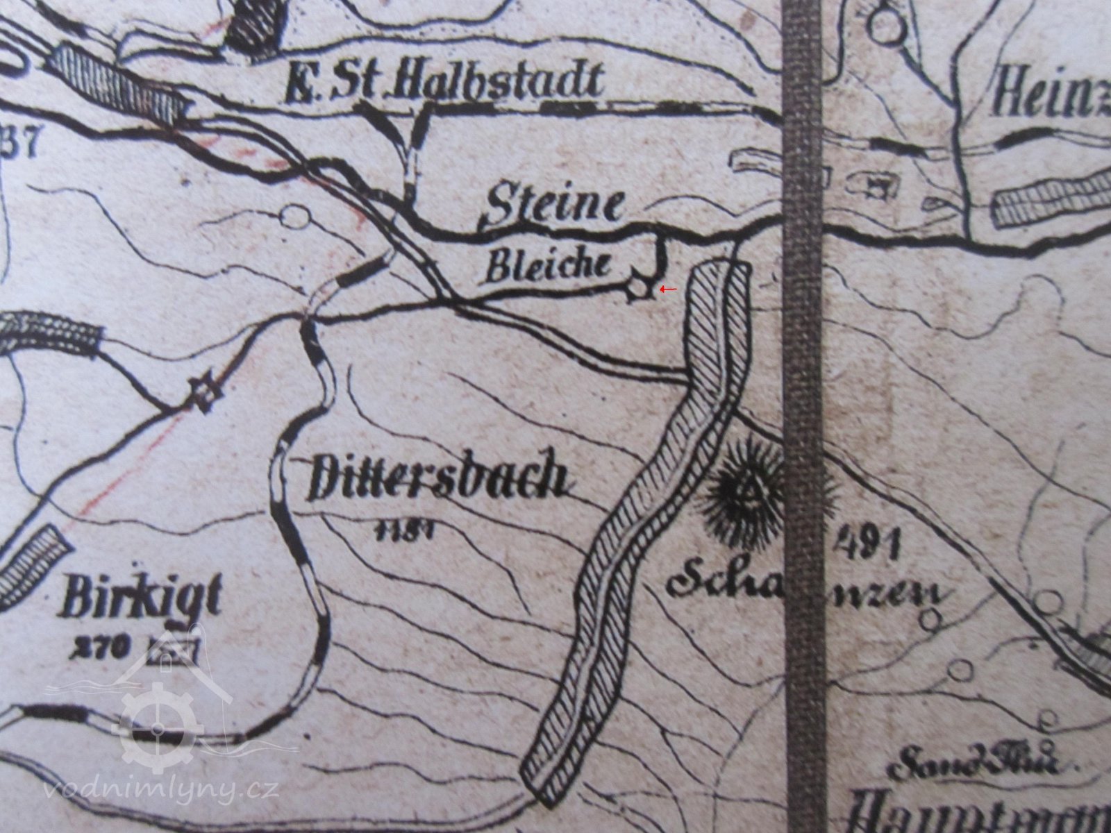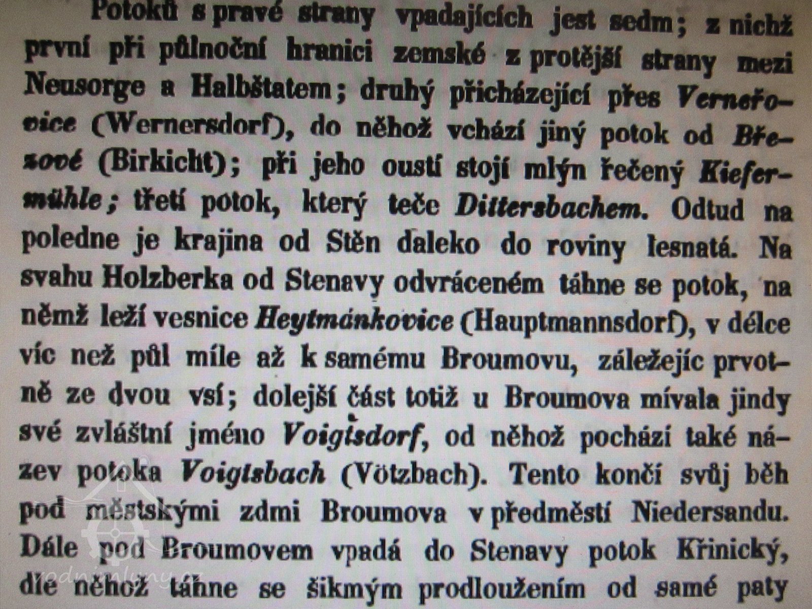 "Potoků spadajících do Stěnavy z pravé strany jest sedm....Druhý jest ten, co protéká přes Verneřovice, do něhož vchází jiný potok od Březové / Birkicht/ a při jehož oustí do Stěnavy stojí mlýn řečený Kiefermühle...".