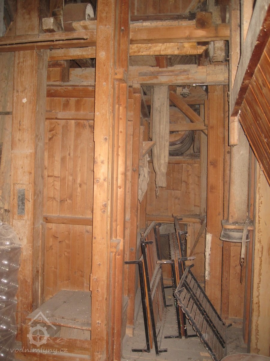 Přízemí jižního dílu severní části dnešní budovy - pod levou násypkou dochována válcová stolice (mimo záběr), květen 2016, © Dušan Žatecký, (Prvky na obrázku: zásobník, násypka)