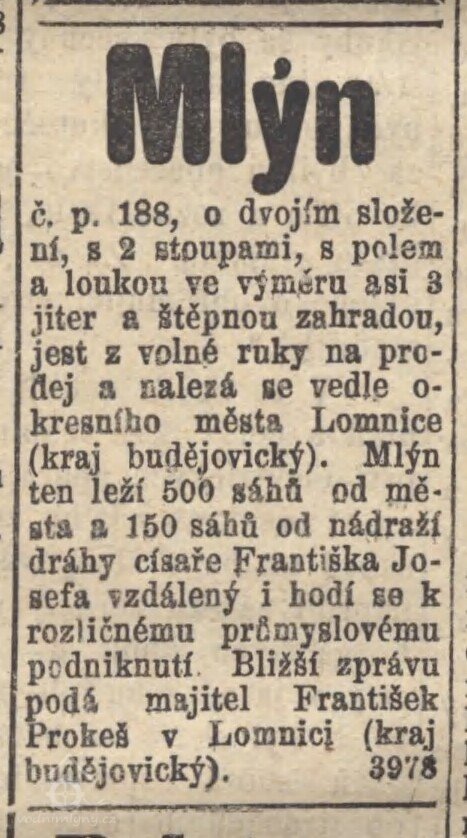 První pokus k založení průmyslu v Lomnici stal se r. 1831. Toho roku žádal Jan Bílek obec Lomnickou o povolení k postavení papírny. Dle potvrzení učil se Jan Bílek v Hrobské papírně 6 let a 14 dní a po vyučení stal se … v papírně Františka Posselta v Chlumu u Třeboně. Papírna však neprosperovala. Jan Bílek byl nucen jí v r. 1847 postoupiti Františku Prokešovi, který v ní dále provoz neudržoval a po vydání povolení přestavěl papírnu na mlýn. Dne 1. července 1882, kdy mlýn vystřídal od roku 1847 několik vlastníků jej převzal děd nynějšího vlastníka Františka Řepy. František Řepa mlýn Papírnu předal jej do vlastnictví 1. února 1891 synu Bohdanovi (Theodorovi) Řepovi.