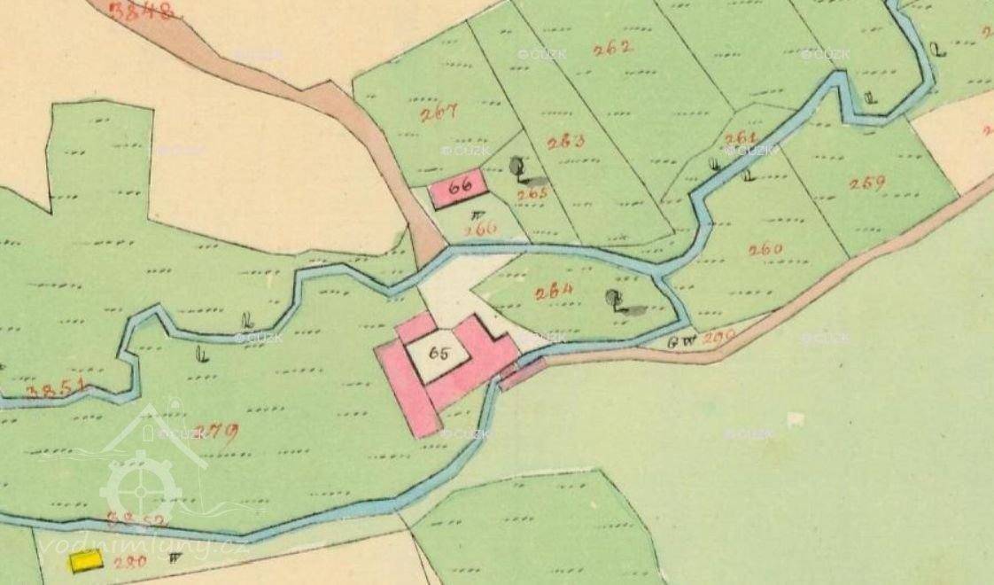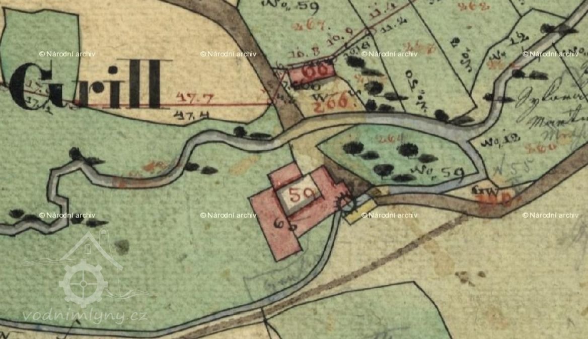 1930 - Jan Jakeš, mlýn a pila, 2 kola na svrchní vodu, průtok 124 l/s, spád vody 450 cm.