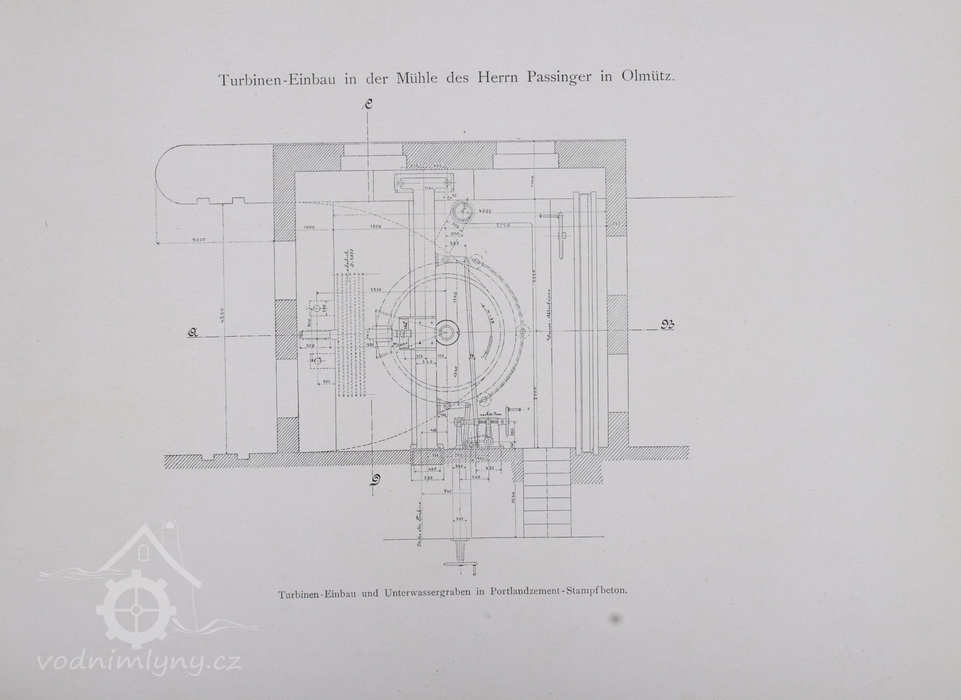 Podle zápisu ve „Vodní knize města Olomouce“, údajně založené roku 1881, příslušelo Passingerům vodní právo na dvě vodní kola o šíři náhonu 1,66 metru a 1,96 metru a dva jalové odpady. Dne 29. července 1880 se konalo jednání o výměně vodních kol za turbínu systému Knap při výkonu 1000/2400 litrů vody za sekundu a to při spádu 2200 milimetrů. Výkon turbíny při plné vodní síle byl 59 HP. Výkon turbíny však nebyl používán pouze pro mletí, ale také pro výrobu elektrického proudu, který firma dodávala po schválení městskou radou ze dne 19. září 1888 městskému divadlu a řadě soukromníků. Vlastní mletí se provádělo v parním mlýně, na který byl vodní mlýn upraven kolem roku 1880.