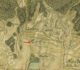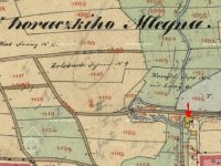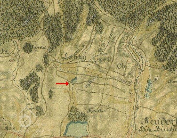 Na císařských otiscích je vyznačen rybník s jeho přítokem a původní koryto řeky, obtékající stavení mlýna. Kolem mlýna vedla polní cesta směrem k Horní Nové Vsi.