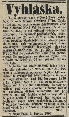 R. 1870 dražba na mlýn po majiteli Janu Šírovi. (RR)