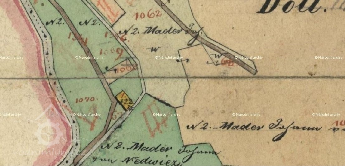 Z toho usuzujeme, že mlýn byl vystavěn někdy v létech 1688 - 1735.Jiřík Mader nebyl dlouho majitelem usedlosti, protože brzy zemřel. Dne 28. listopadu 1737 se ji ujal Kryštov Smola. Dne 9. března 1754 pak tento "pastorní otec" předal usedlost Karlovi Madrovi k dědičnému užívání. Po jeho smrti se gruntu ujal opět poručník, a to Jan Novotný z Kounova.