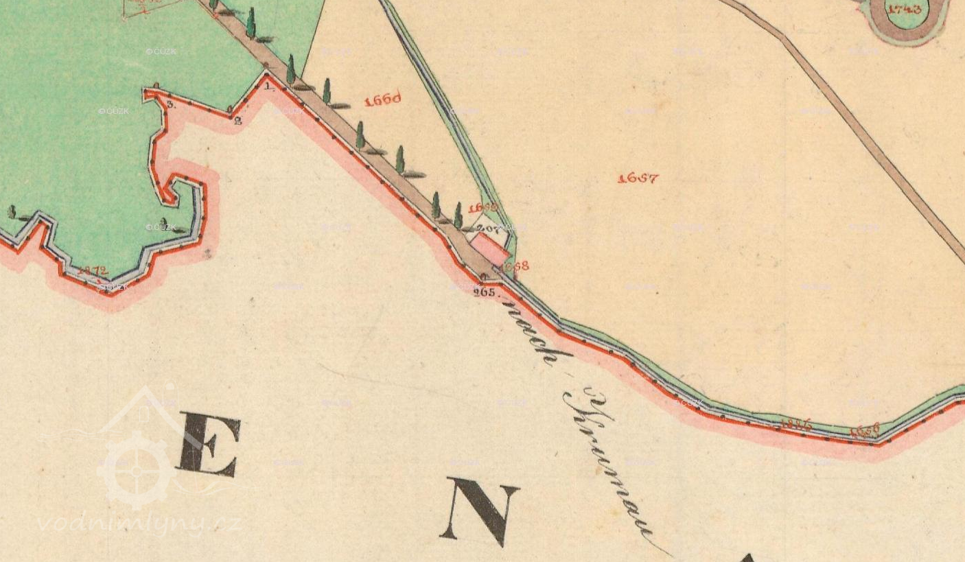 Mlýn zaniklý po roce 1952. Původně býval mlýn a hlavně jeho vodní dílo začleněny do zámeckého parku Červeného dvora.