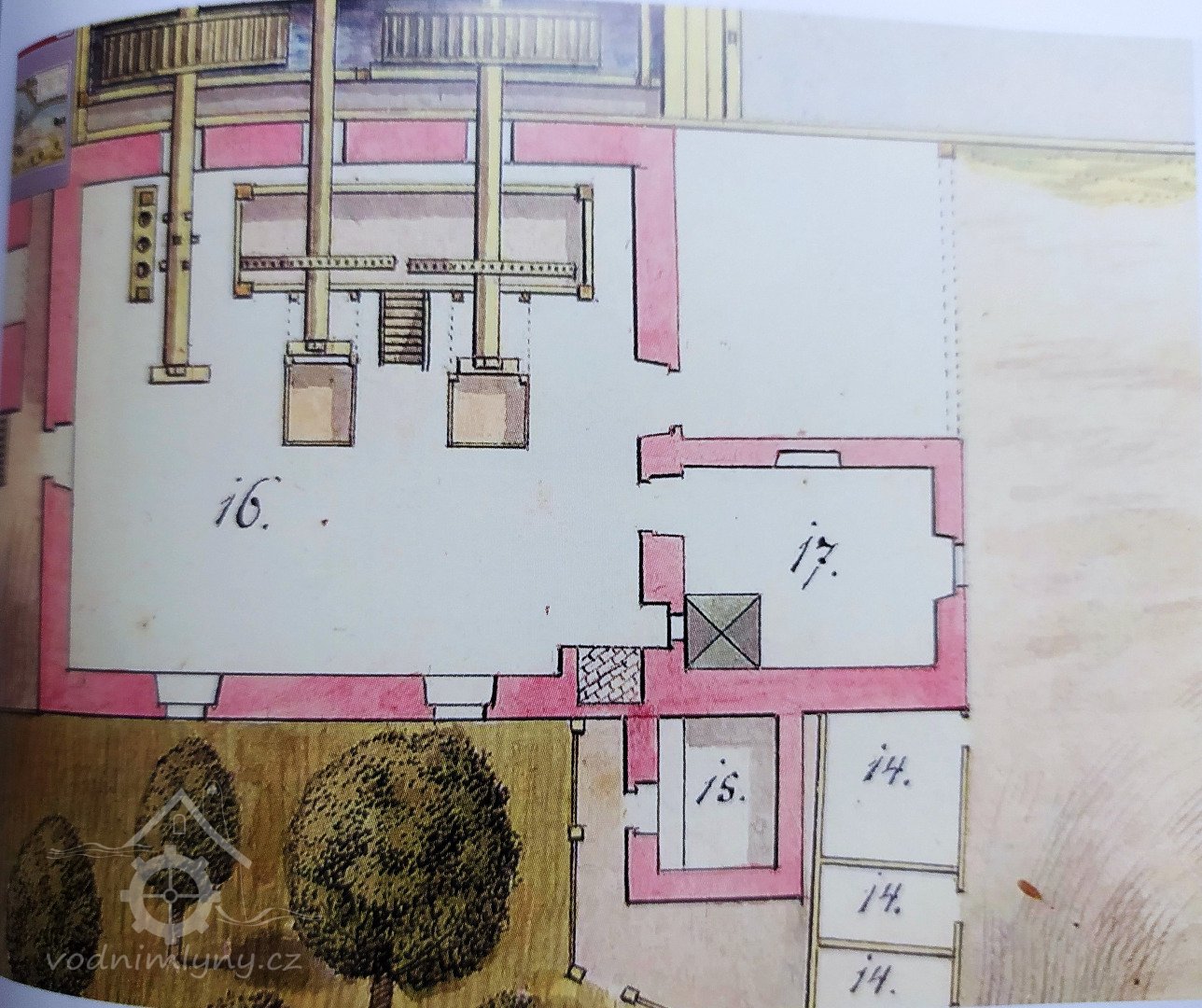 Popis1930: 2 kola na spodní vodu, hltnost 0,713 m3/s, spád 1,4 m, výkon 6 HP