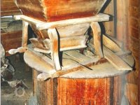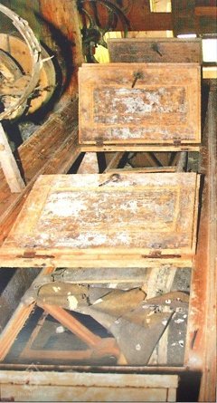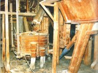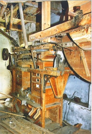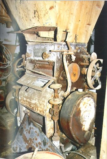 V I. patře mezi okny savka na třídění krupic, kamenné složení je šrotování, hranolové vysévače a násypky k mlecím stolicím.