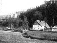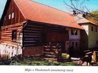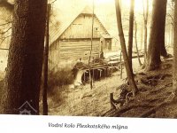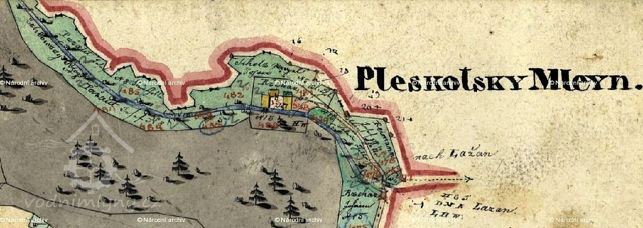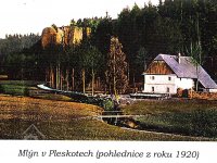 1754 - postaven mlýn s povolením kostecké vrchnosti mlynářem Tomášem Roudným. O mlýnu více Josef Pekař v Knize o Kosti: „Od mlýna Podvyskeřského (kde byl dnes zaniklý rybník) až skoro k mlýnu Nebákovskému pod Troskami šla tedy hranice mezi kosteckým a skalským panstvím divokým údolím Lažanským. Mlýn tu však náležel ke Kosti jen jediný, rozkošně položený mlýn Pleskotský. Byl postaven teprv roku 1754 mlynářem Tomášem Roudným. … Nový mlýn o dvou složeních, k němuž si mlynář vedl strouhu od rybníka Podsemínského, byl proto vložen do gruntovních knih v ceně veliké, 1500 kop míšeňských. ...“ ( s. 226)