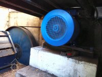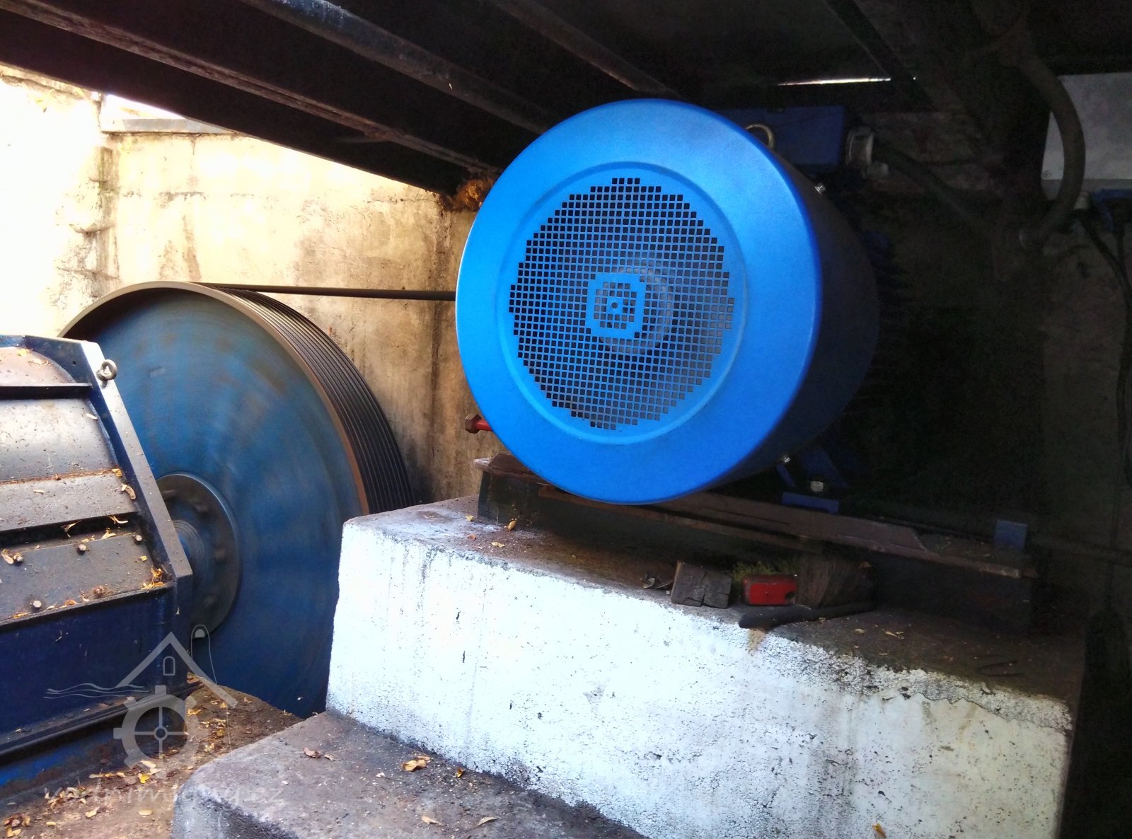 převod přes klínový řemen od turbíny na asynchronní generátor, 2016, © David Veverka, (Prvky na obrázku: Turbína, transmise, řemenice, převody, výroba elektrické energie)