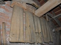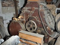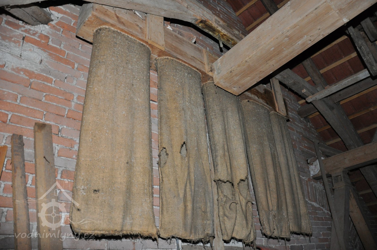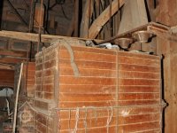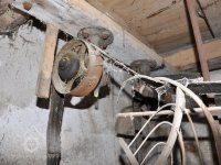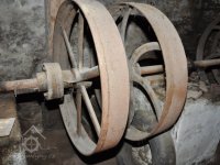 rolny lomící osu řemenu z horizontální transmise na vertikální k pohonu kamenného složení, 2015, © David Veverka, (Prvky na obrázku: transmise, řemenice, převody)